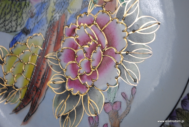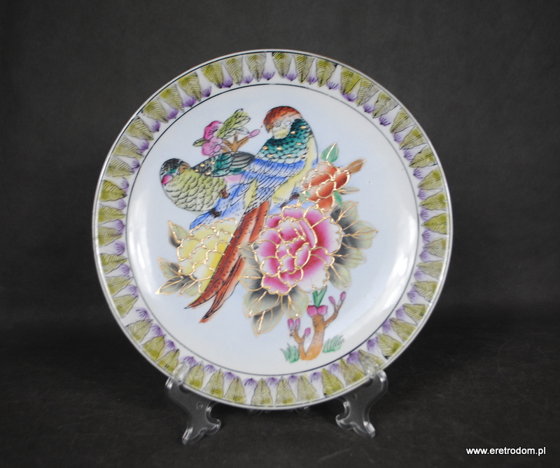 Talerz dekoracyjny. Biała porcelana ozdobiona motywem ptaków, złocona. Od spodu mało czytelny wycisk w masie.