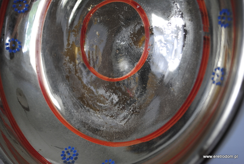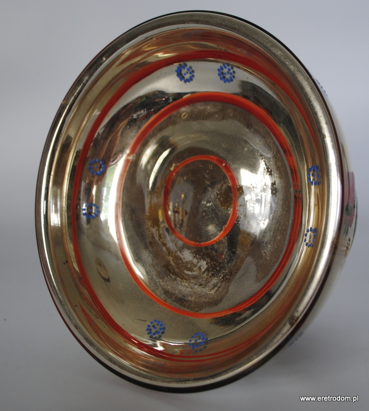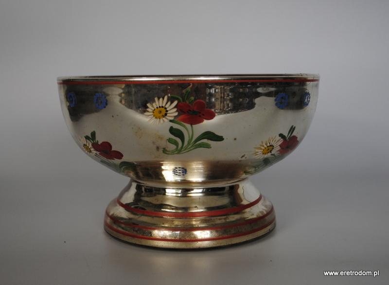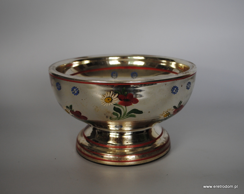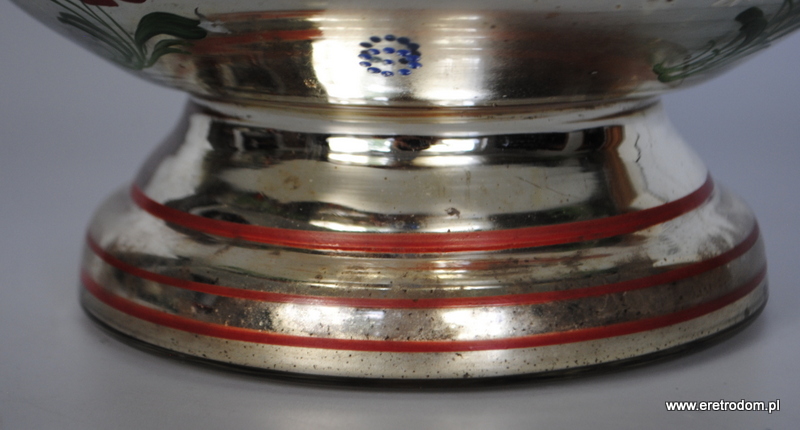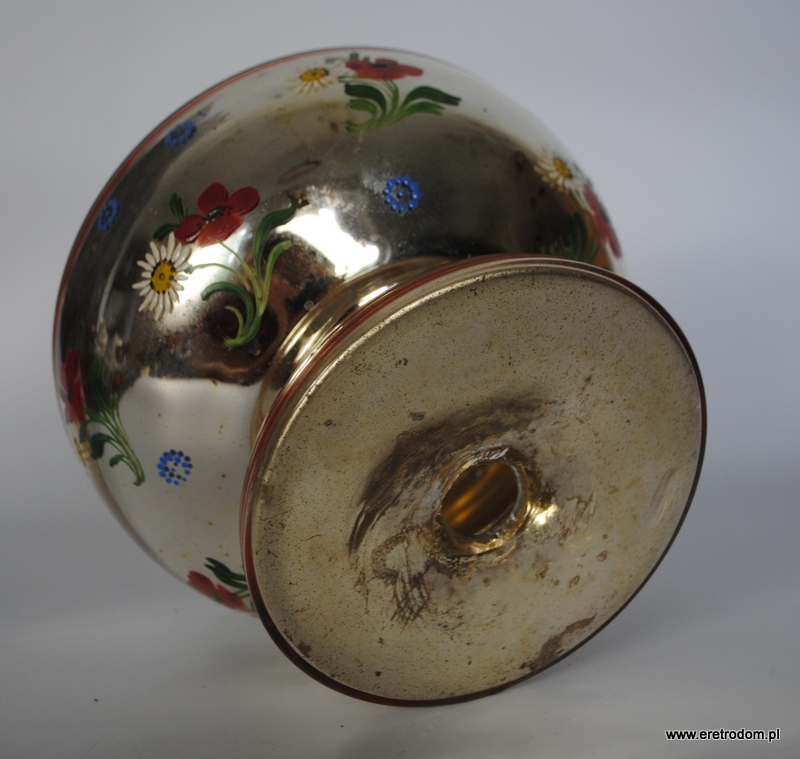Pojemnik na lód? Stare szkło, ręcznie malowane w kwiaty. Od spodu otwór. Od środka pomalowany na srebrno.