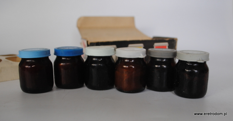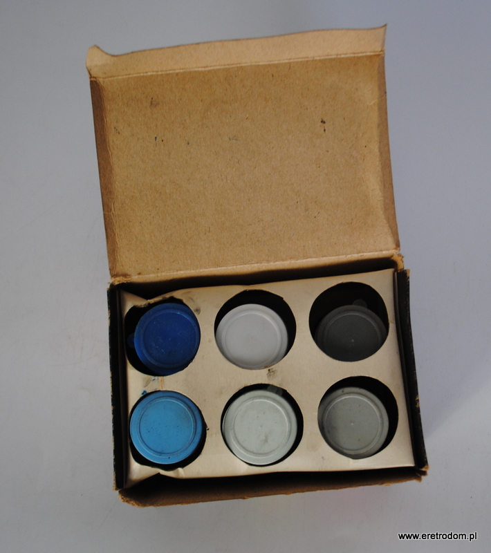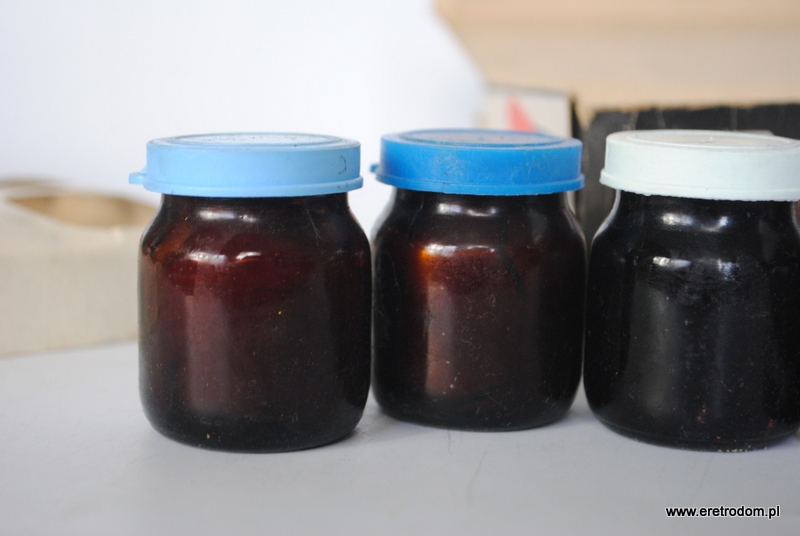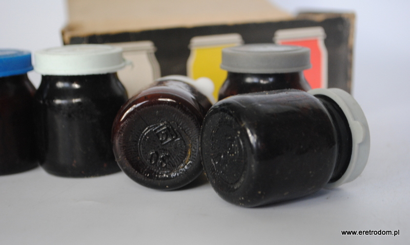Pollena Astra, farby w słoiczkach. II poł. XXw. Najprawdopodobniej już wyschnięte.