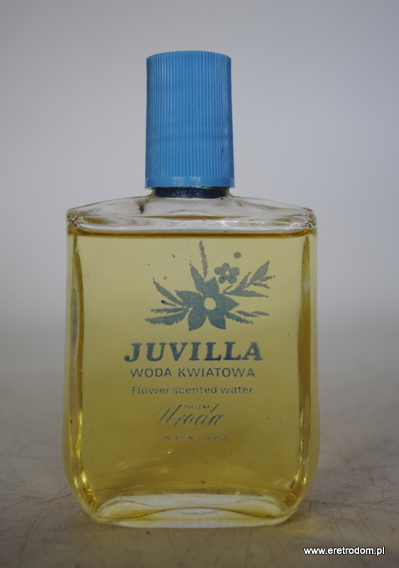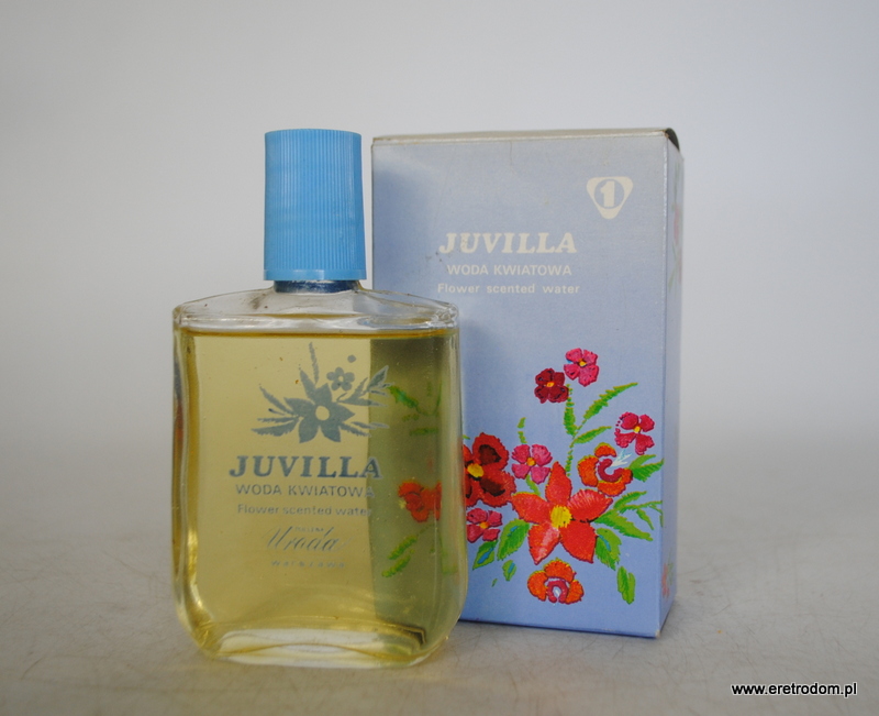 Woda kwiatowa Juvilla (Pollena Warszawa), II poł. XXw. Butelka wraz z oryginalnym opakowaniem.