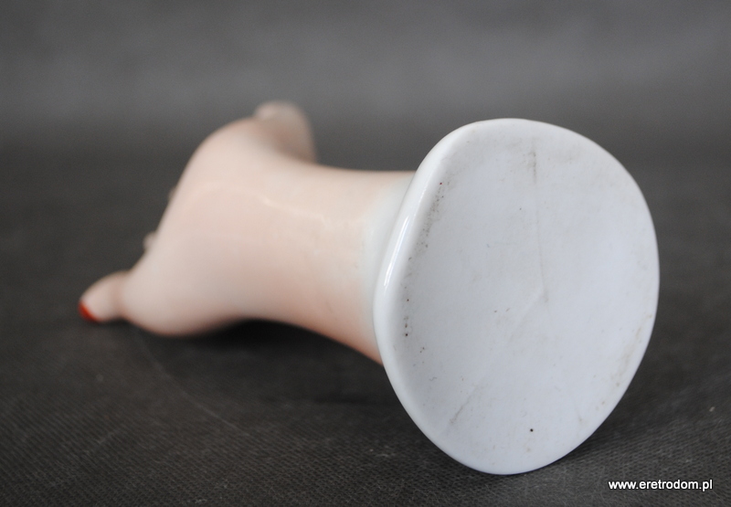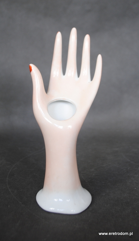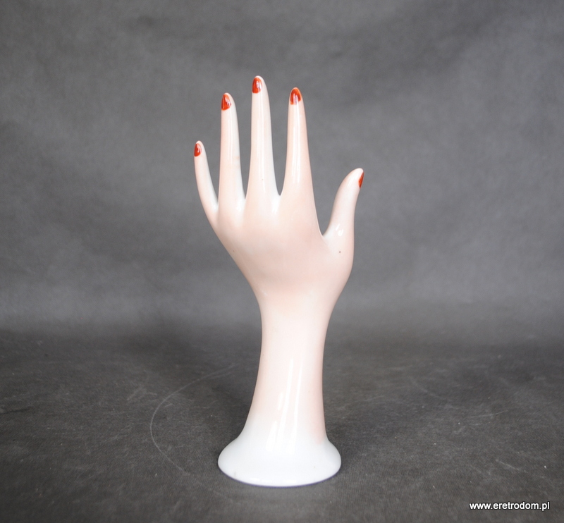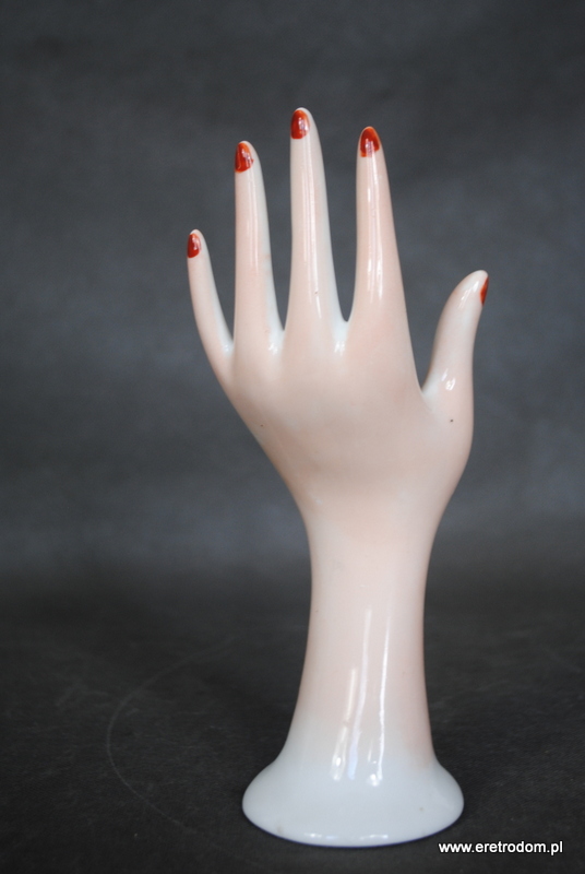 Dłoń wykonana z porcelany. W kolorze lekkiego różu imitującego kolor ludzkiej skóry, zalotności dodają paznokcie pomalowane na czerwony kolor. Fajny element wystroju toaletki, stojak na pierścionki, bransoletki itp…