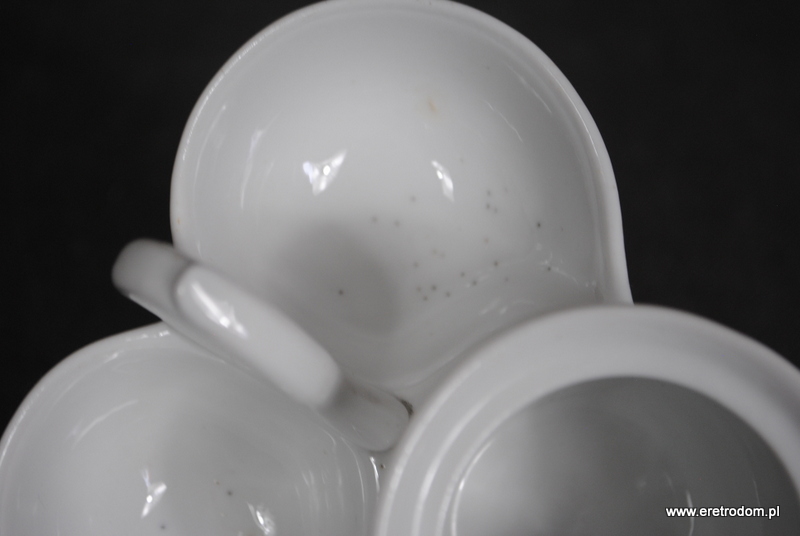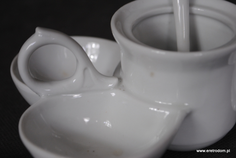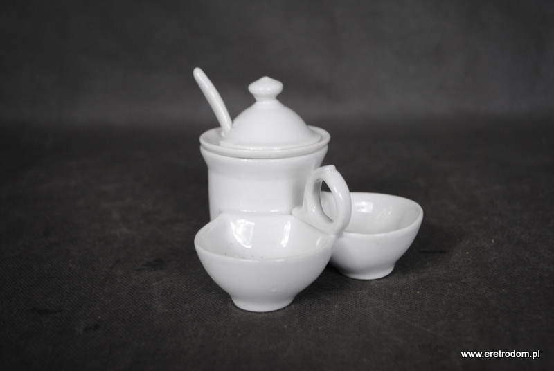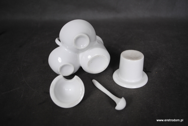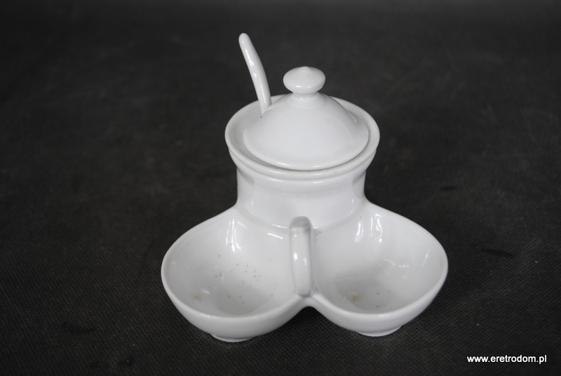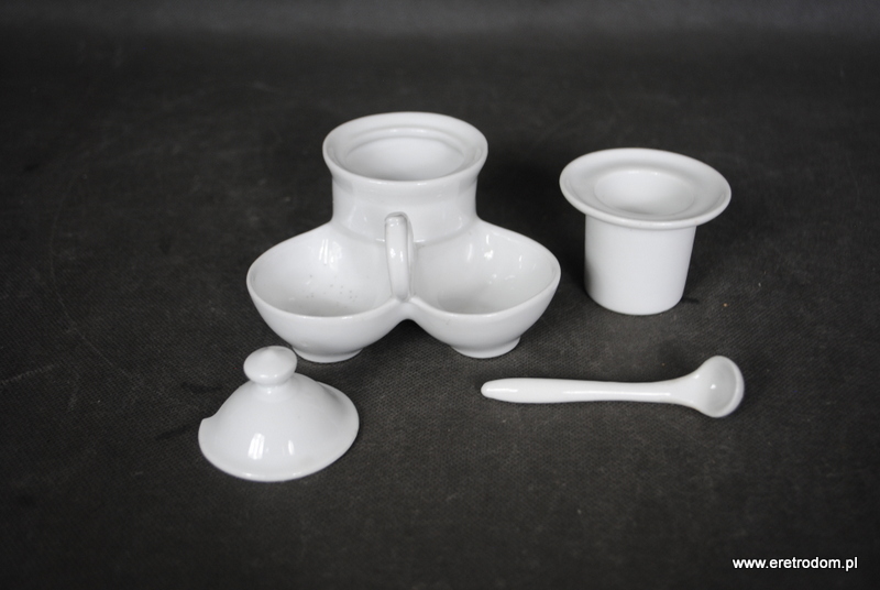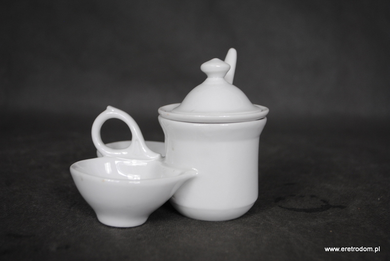 Przyprawnik wykonany w I poł.XXw. . Biała porcelana, szkliwiona. W zestawie łyżeczka.