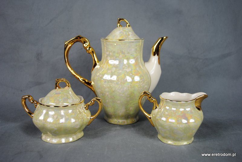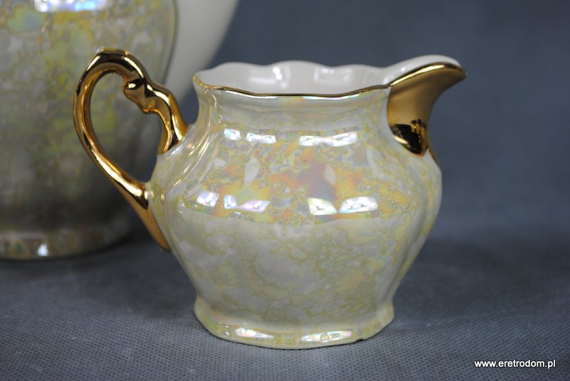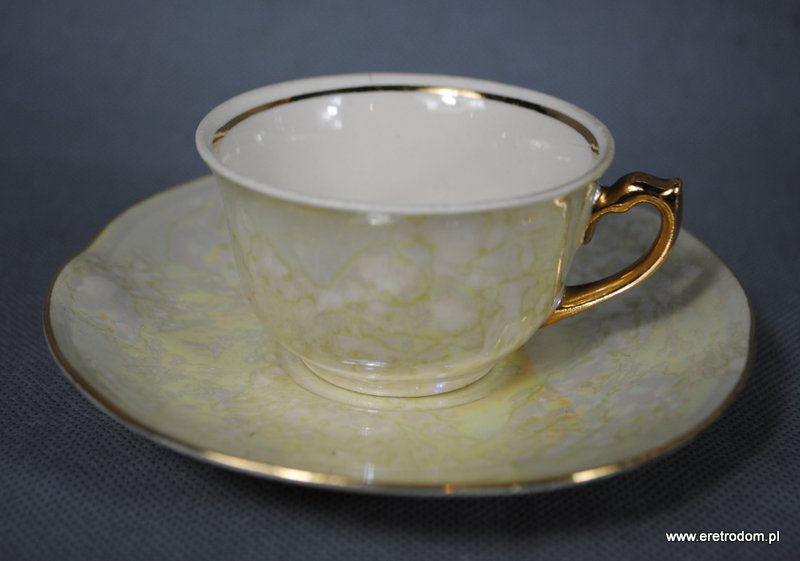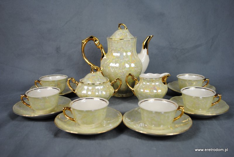 Kompletny serwis dla 6 osób, porcelit Chodzież fason 1500 w marmurku cytrynowym z dodatkiem złoceń, całość bardzo dekoracyjna i efektowna.