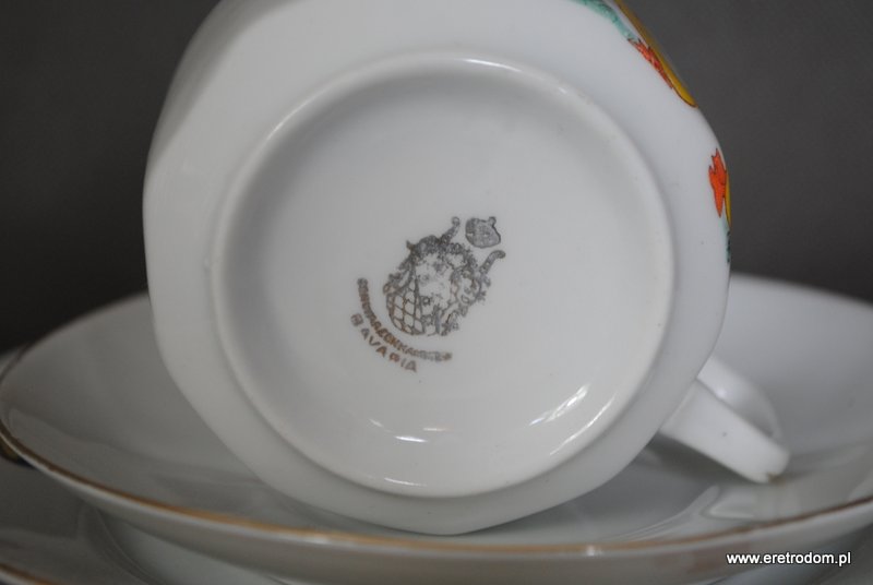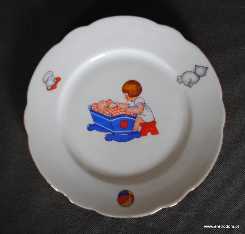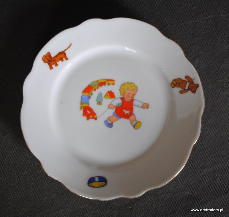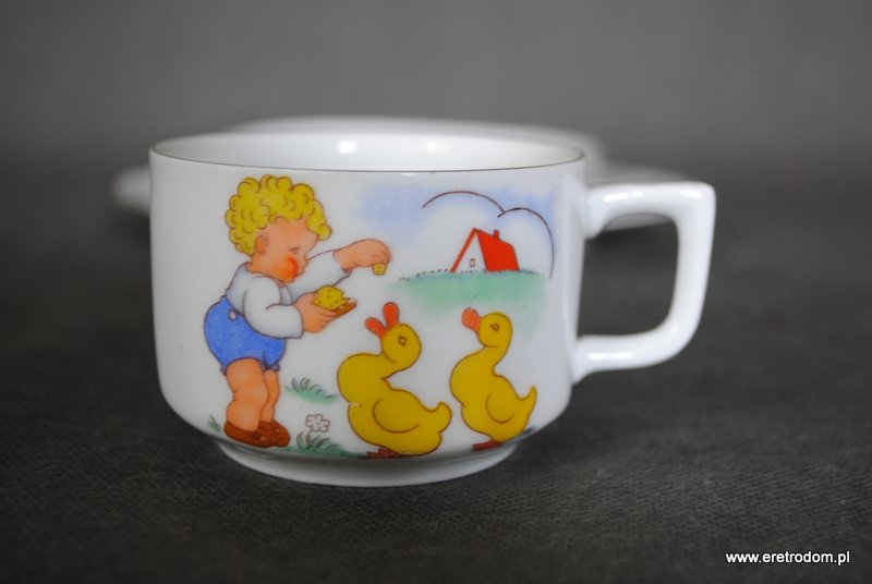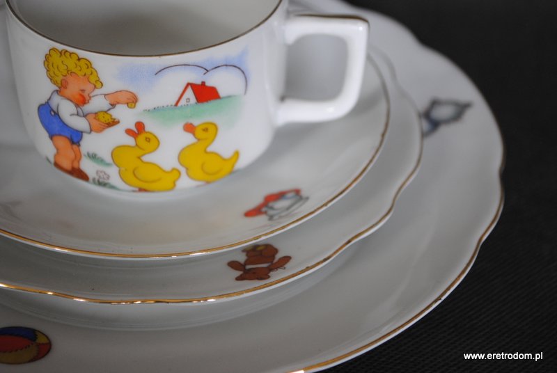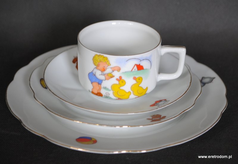 Uroczy komplet dziecięcy składający się z 4 elementów. Wyprodukowany w latach 1905-1923 przez Porzellanfabrik Schumann & Schreider. Biała porcelana ozdobiona dziecięcymi kalkami.