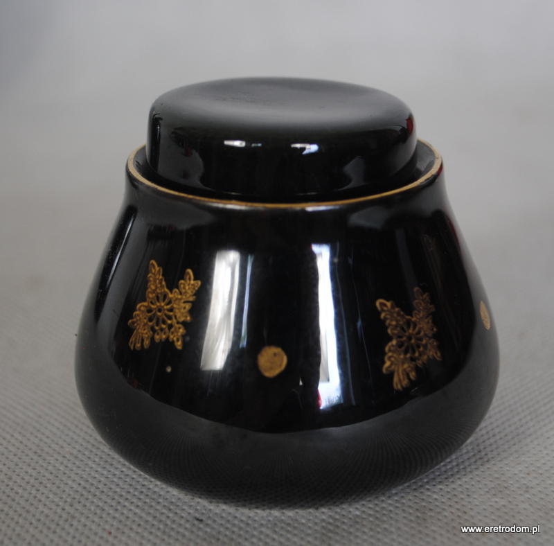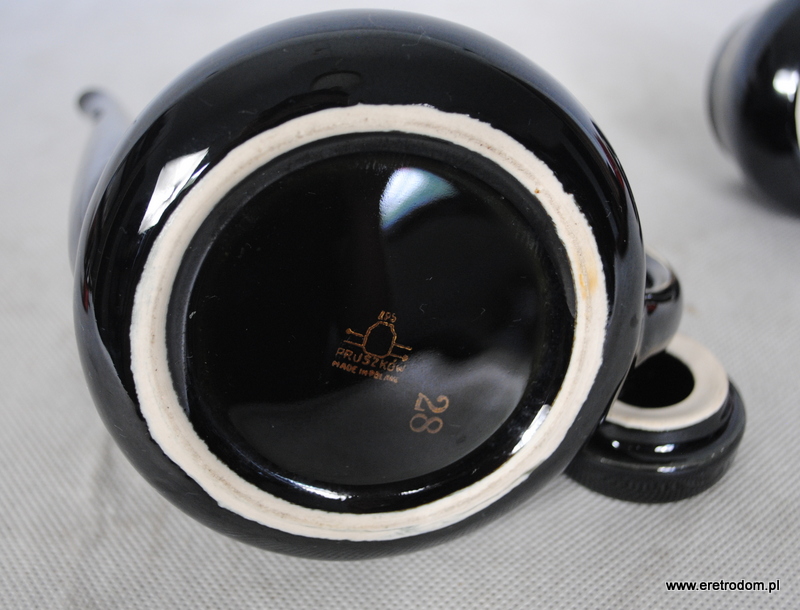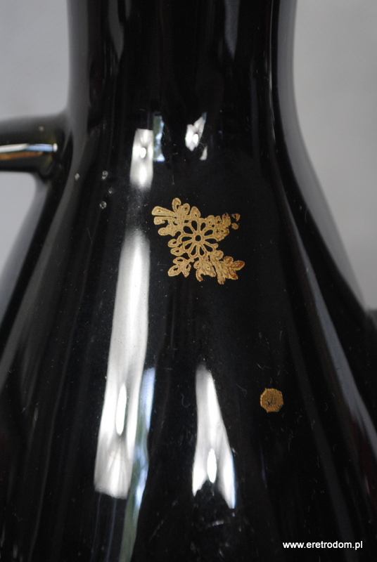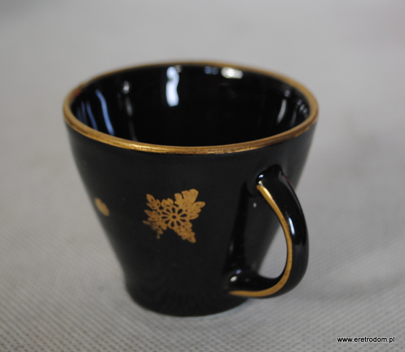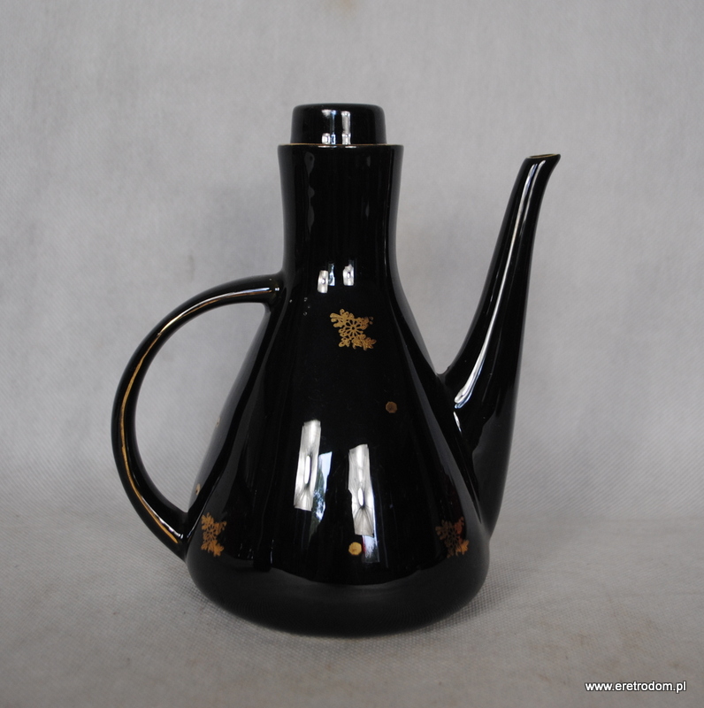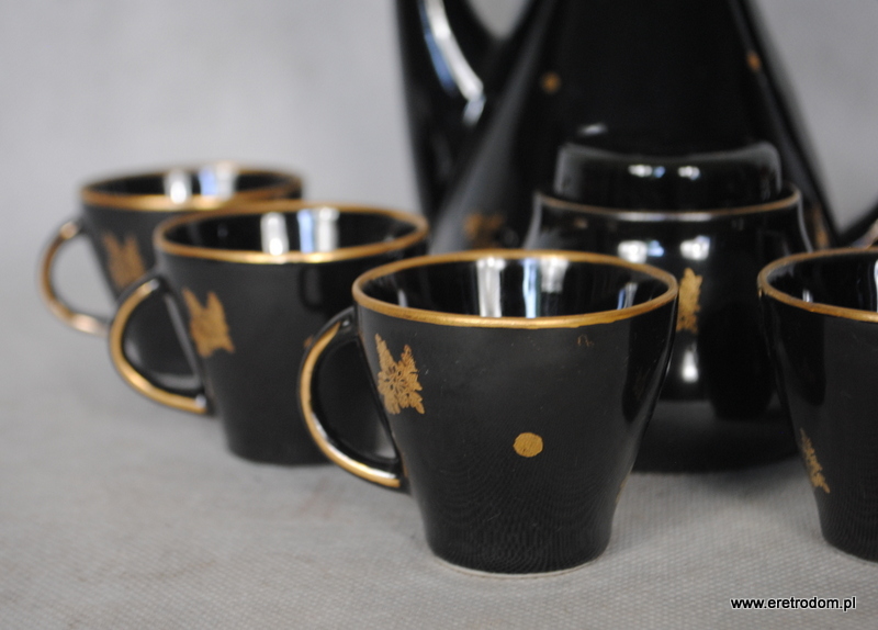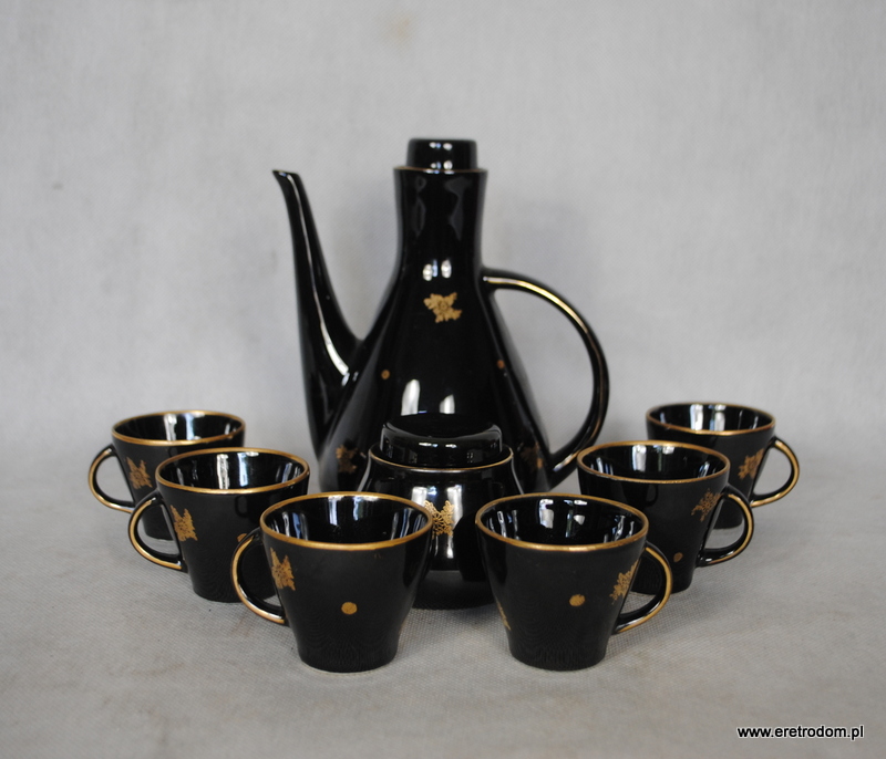 Zestaw do kawy dla 6 osób, fason Kajtek. Sygnowany Pruszków. Czarna malatura ze złotymi dodatkami. W skład wchodzi dzbanek, cukiernica oraz 6 filiżanek.