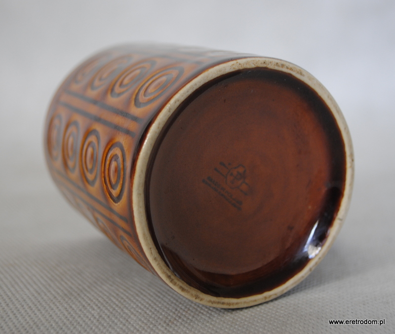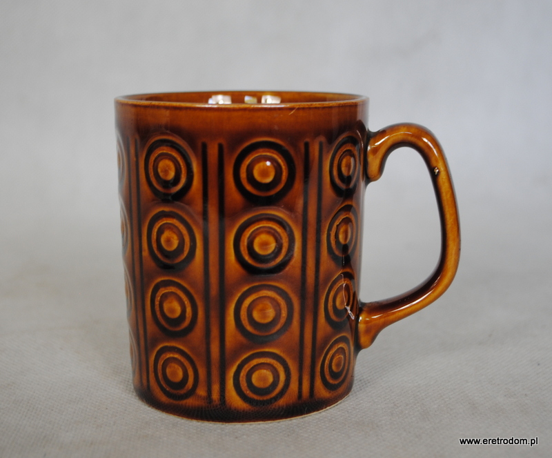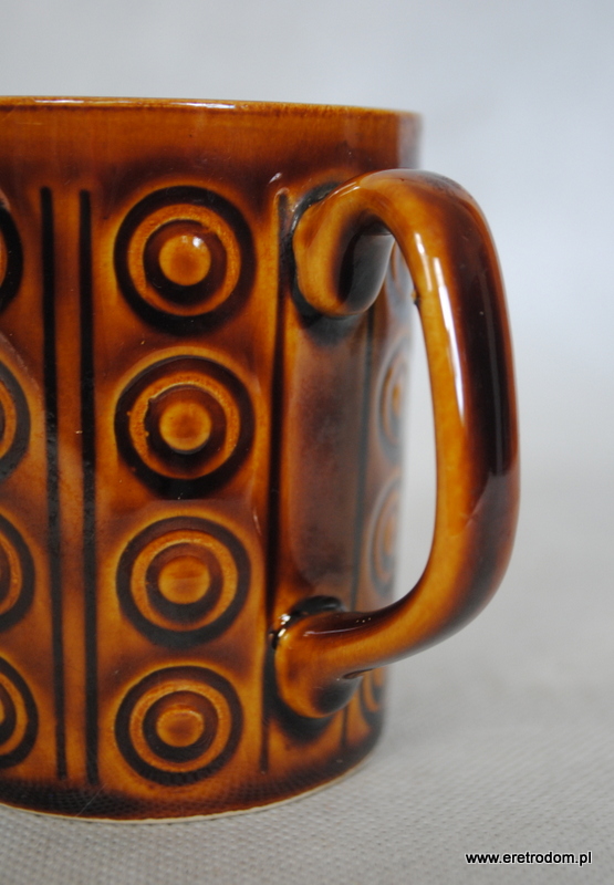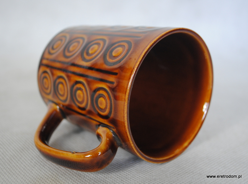 Kubek sygnowany Pruszków, model nazywany „koła”. Porcelit szkliwiony na brązowy kolor.