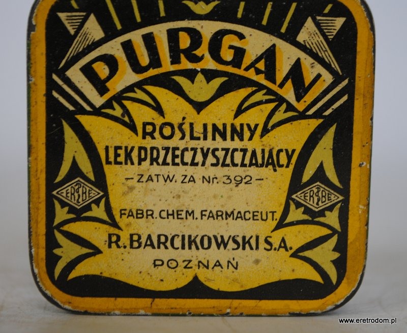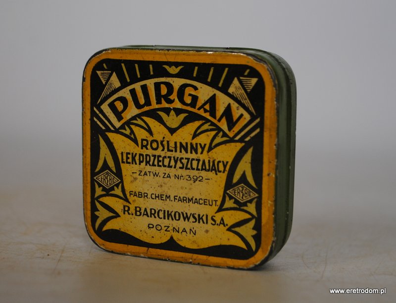 PURGAN, roślinny lek przeczyszczający. Puszka metalowa.