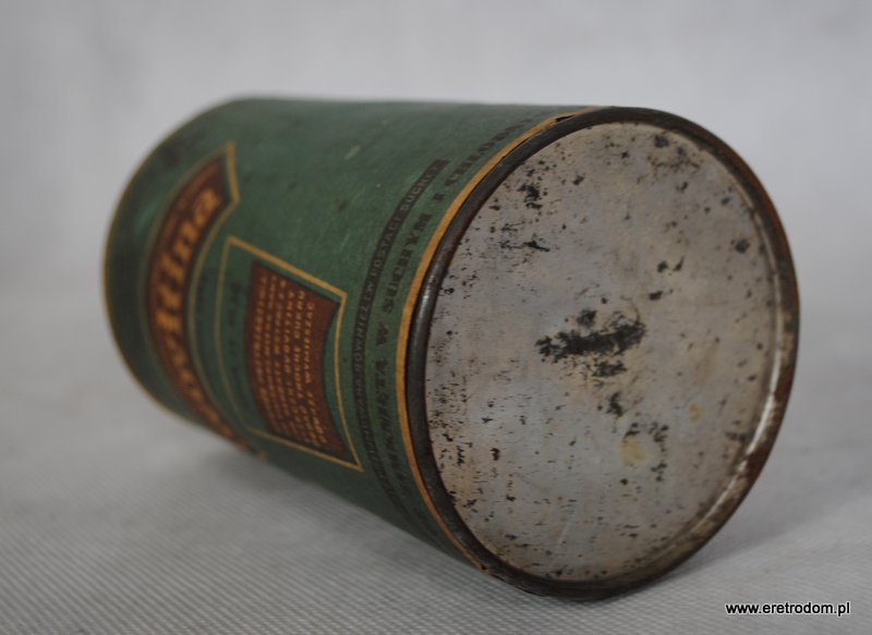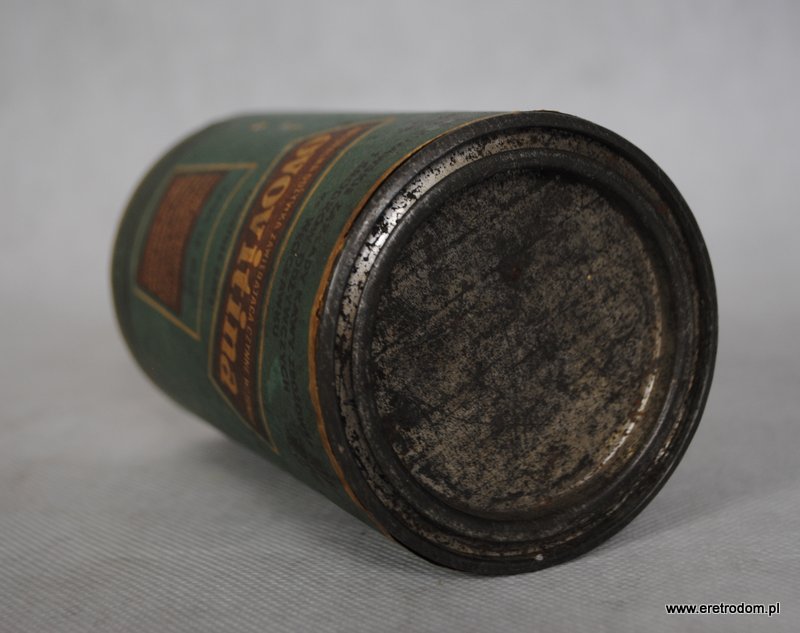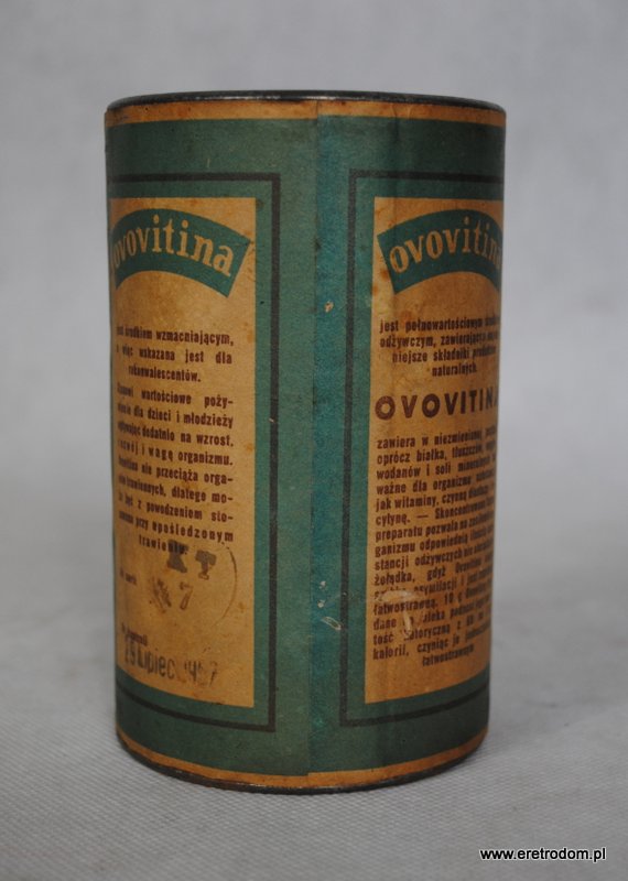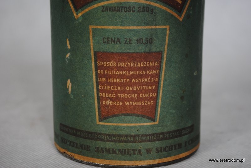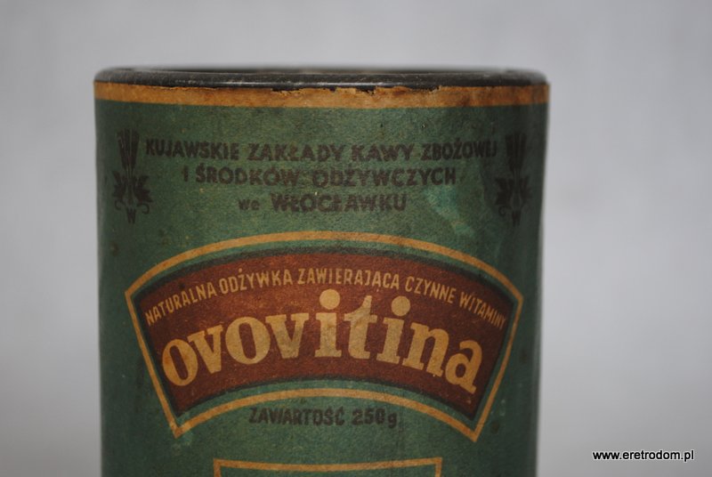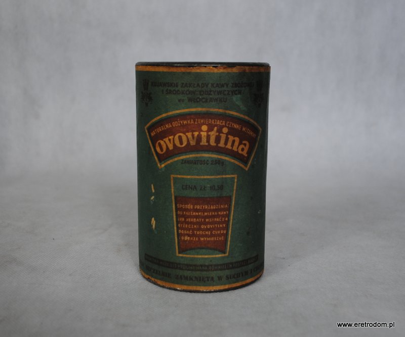 Metalowa puszka z czasów prl. Opakowanie po ” Ovovitinie”, produkcja: Kujawskie Zakłady Kawy Zbożowej i Środków Odżywczych ze Włocławku. Metalowa puszka, etykieta papierowa.
