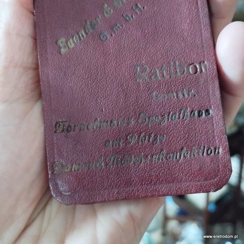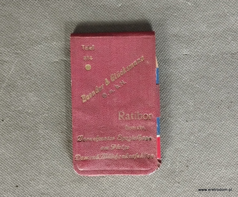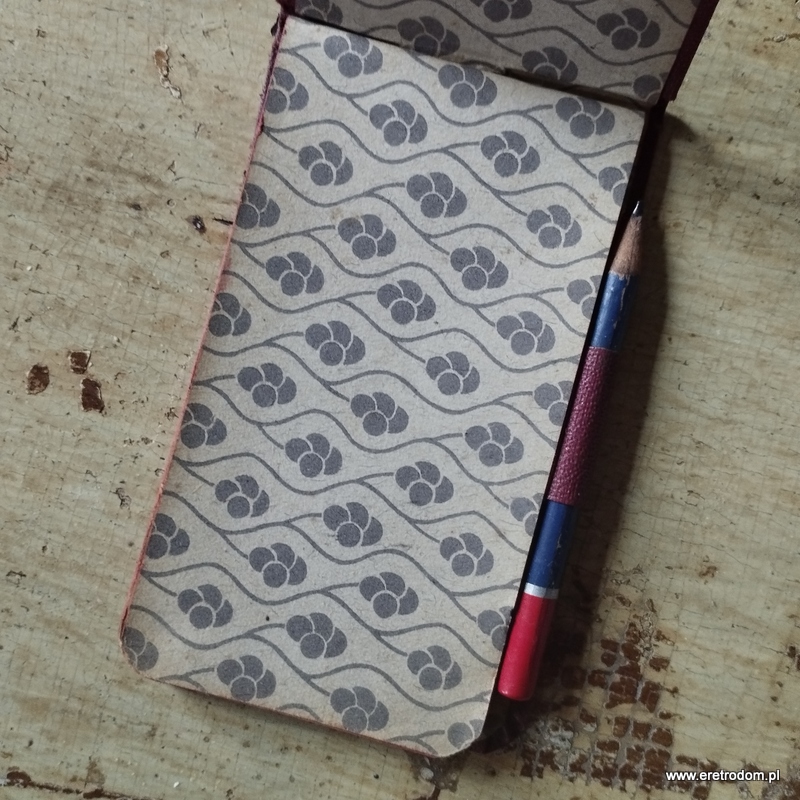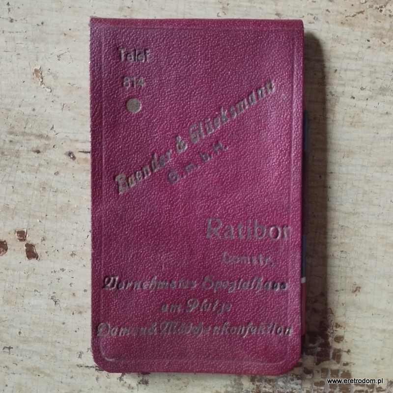 Notes kieszonkowy wydany przez Baender & Glueksmann (Ratibor- Racibórz). Twarda oprawa, w środku kartki w karatekę, częściowo zapisane. W zestawie z ołówkiem.