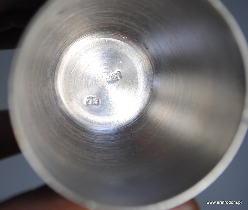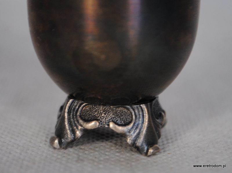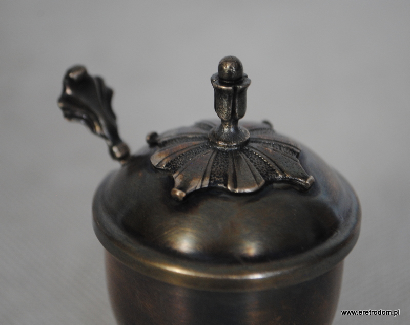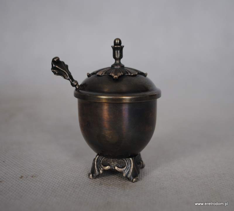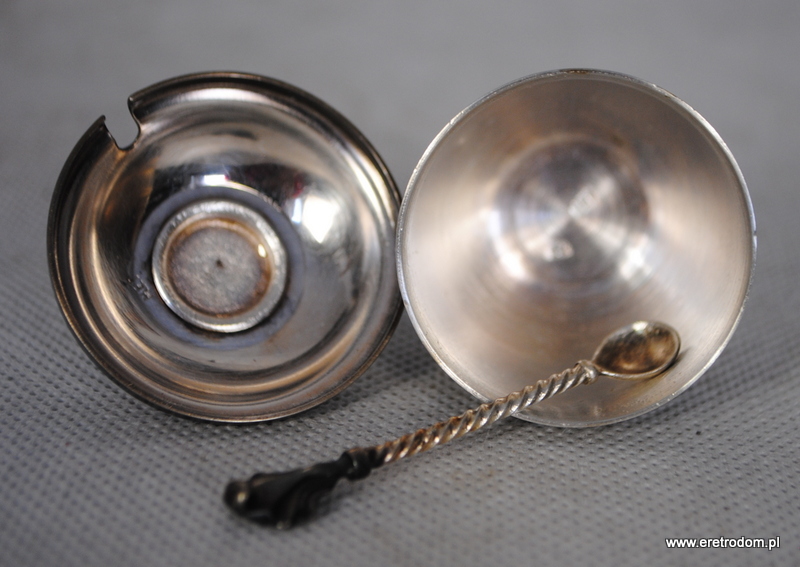 Solniczka czy też mała cukierniczka. Polska produkcja z II poł. XXw. Metal platerowane srebrem. W komplecie łyżeczka.