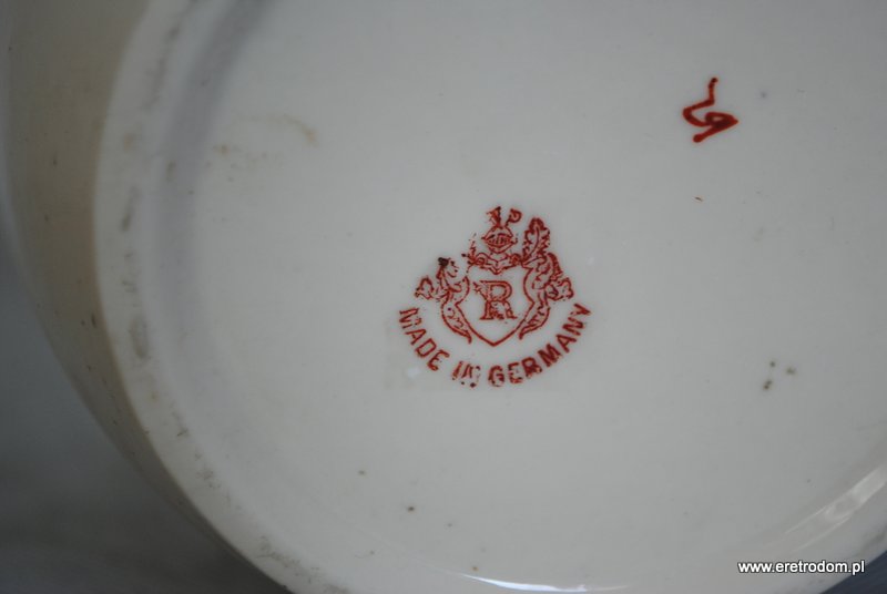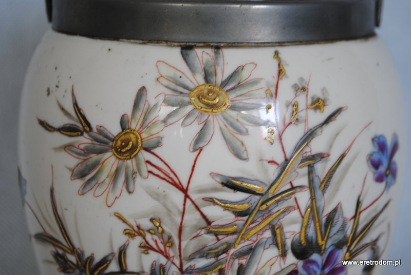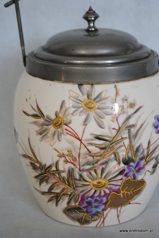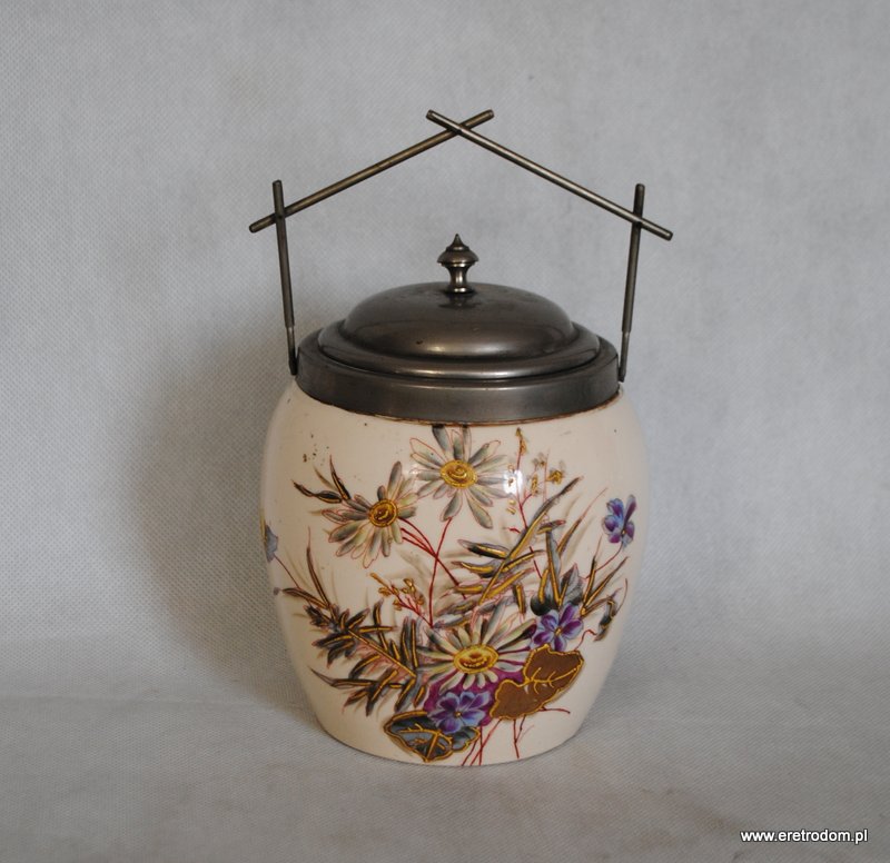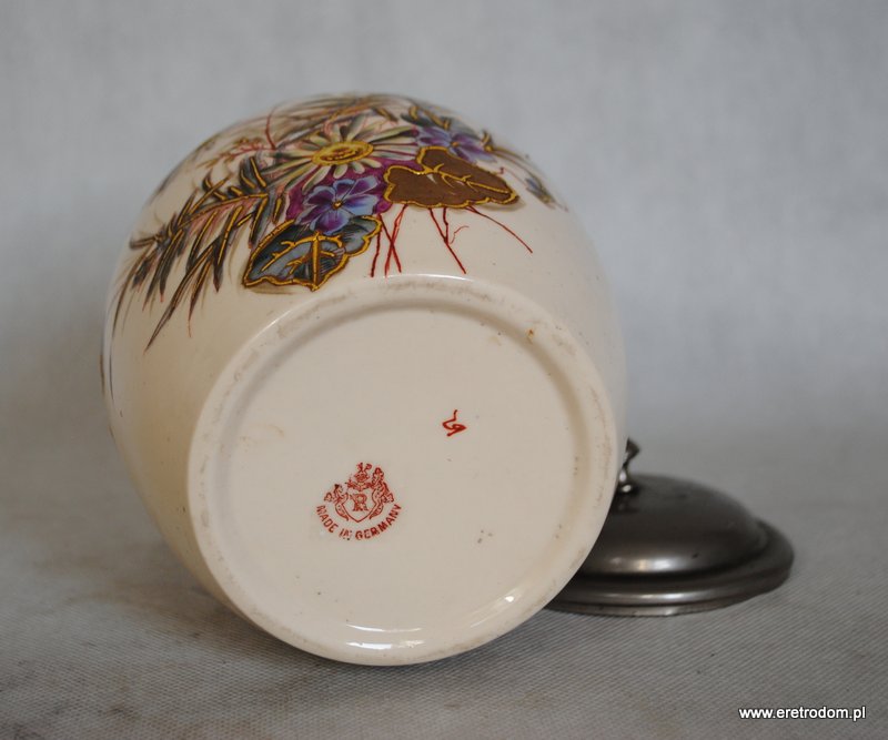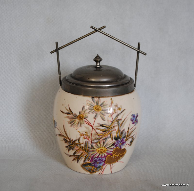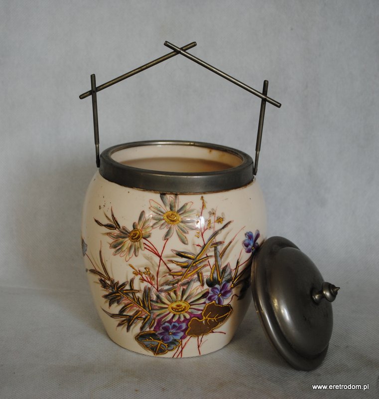 Biszkoptnica sygnowana Roschützer Porzellanfabrik Unger & Schilde (1906r – 1968r.). Porcelana w kolorze śmietanki, pięknie ręcznie malowana. Uchwyt oraz przykrywa wykonane z metalu.