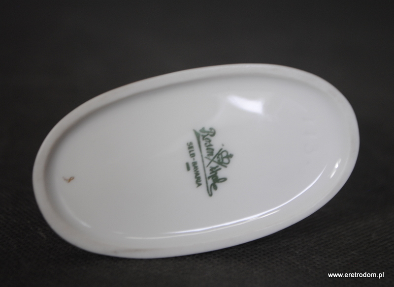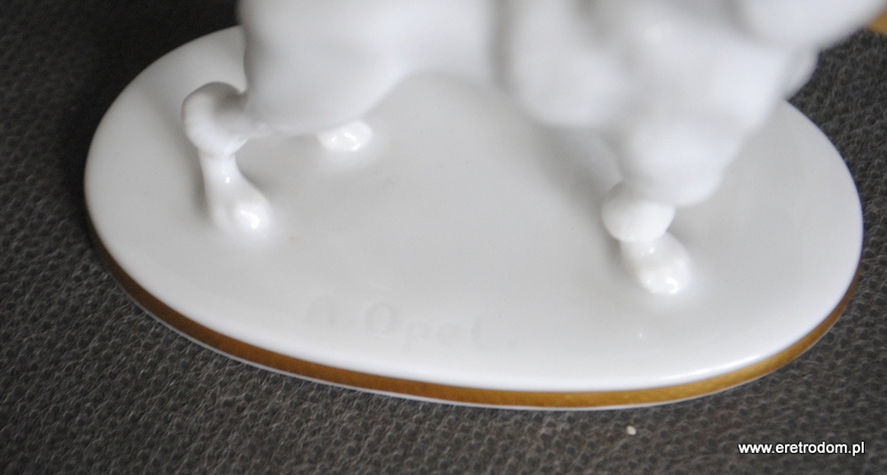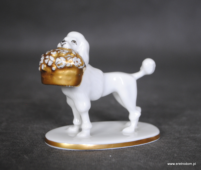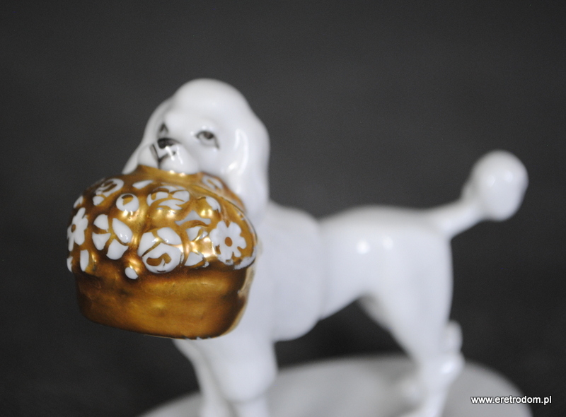 Figurka przedstawiająca pudla z koszem kwiatów. Projekt Adolfa Opla dla manufaktury Rosenthal ( I poł. XXw.). Biała porcelana, złocona.