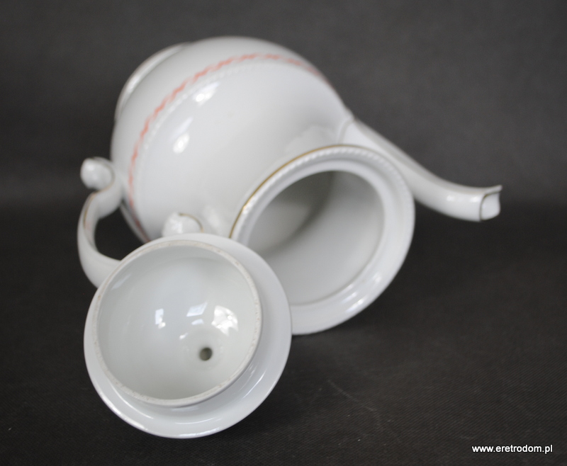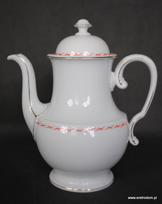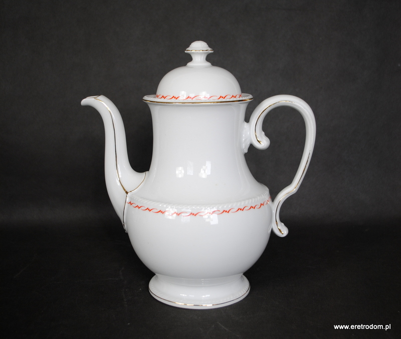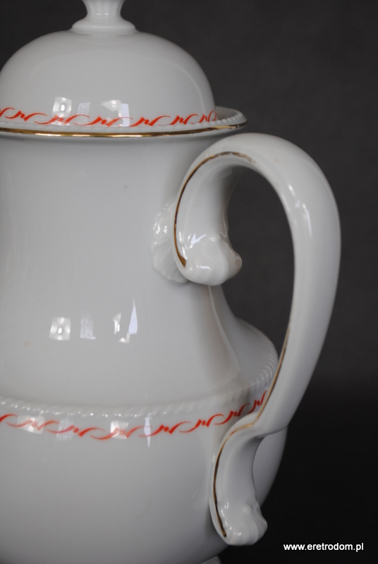 Dzbanek, fason Hildegard. Wyprodukowany przez niemiecką firmę Rosenthal (sygnatura z I poł. XXw) . Biała, delikatna porcelana ozdobiona przy rantach czerwonym szlaczkiem oraz złoceniem.
