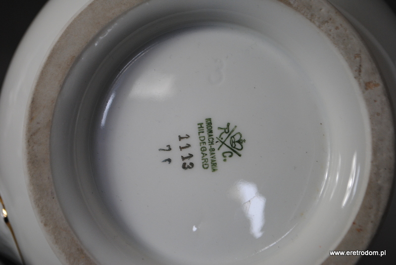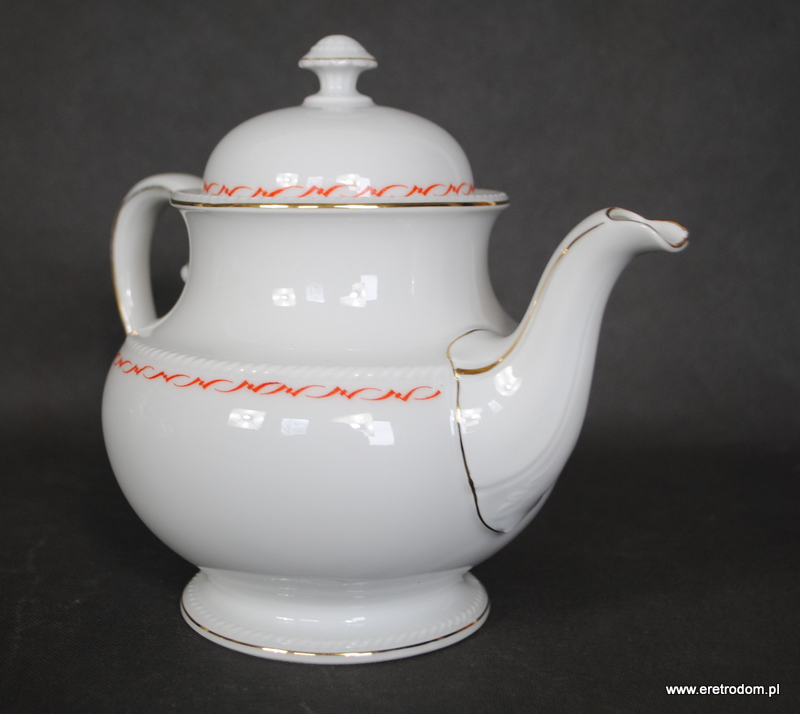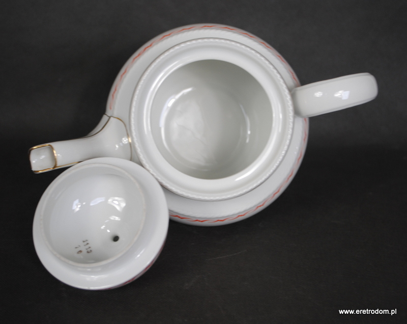 Dzbanek, fason Hildegard. Wyprodukowany przez niemiecką firmę Rosenthal (sygnatura z I poł. XXw) . Biała, delikatna porcelana ozdobiona przy rantach czerwonym szlaczkiem oraz złoceniem.