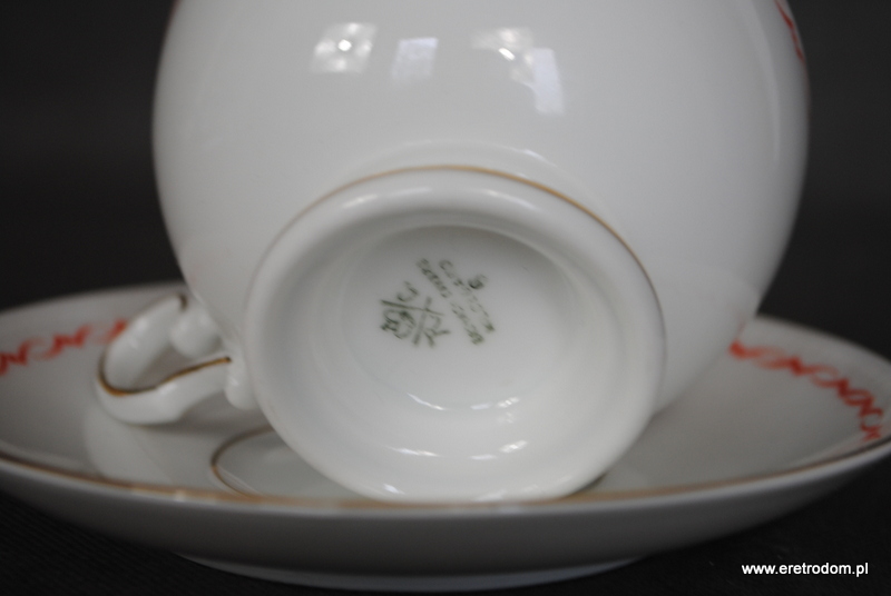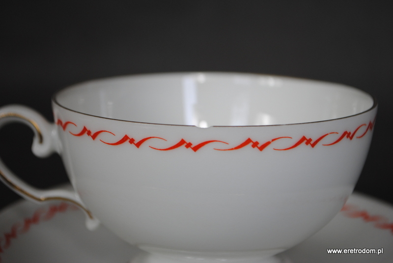 Filiżanka ze spodkiem, fason Hildegard. Wyprodukowana przez niemiecką firmę Rosenthal (sygnatura z I poł. XXw) . Biała, delikatna porcelana ozdobiona przy rantach czerwonym szlaczkiem oraz złoceniem.