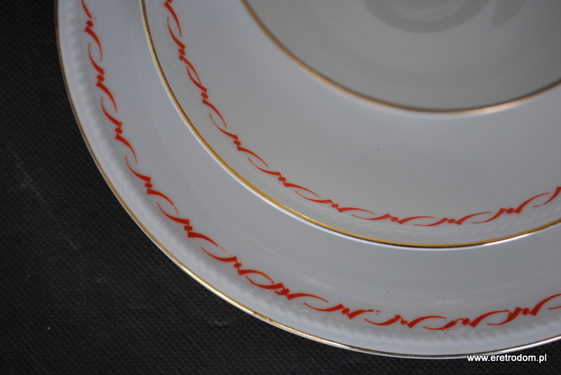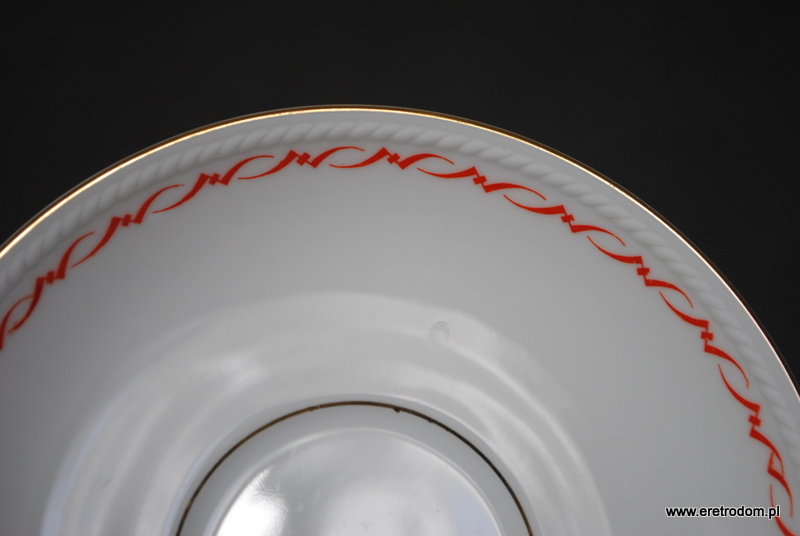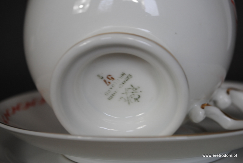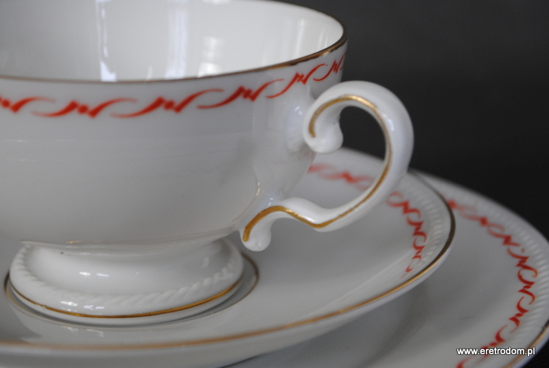Filiżanka ze spodkiem oraz talerzykiem deserowym, fason Hildegard. Wyprodukowana przez niemiecką firmę Rosenthal (sygnatura z I poł. XXw) . Biała, delikatna porcelana ozdobiona przy rantach czerwonym szlaczkiem oraz złoceniem.