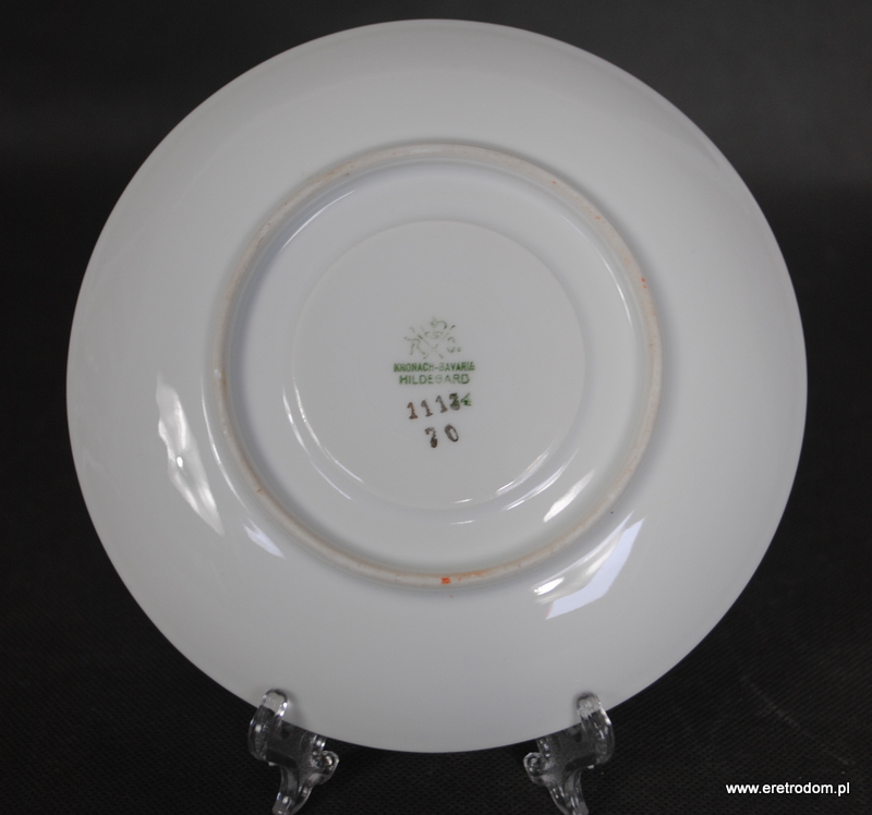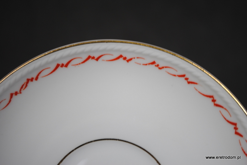 Spodek, fason Hildegard. Wyprodukowany przez niemiecką firmę Rosenthal (sygnatura z I poł. XXw) . Biała, delikatna porcelana ozdobiona przy rantach czerwonym szlaczkiem oraz złoceniem.