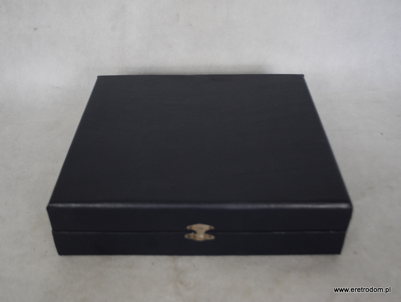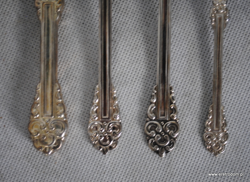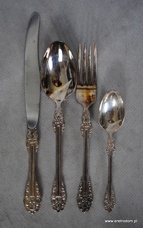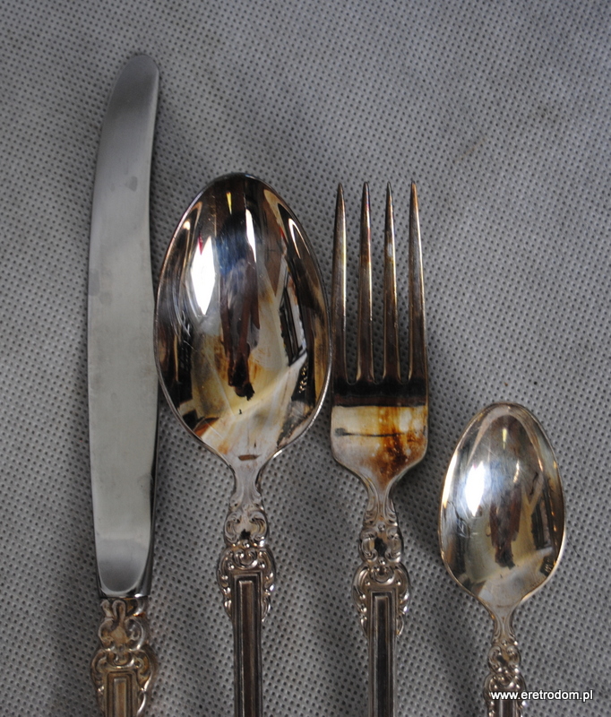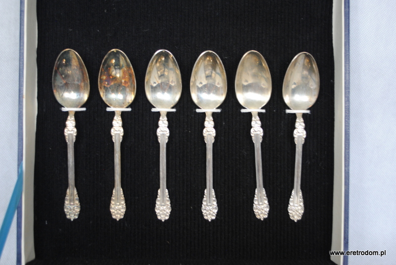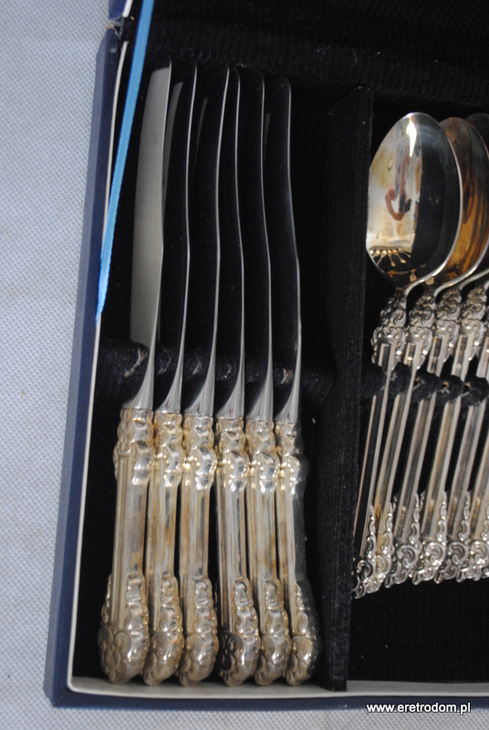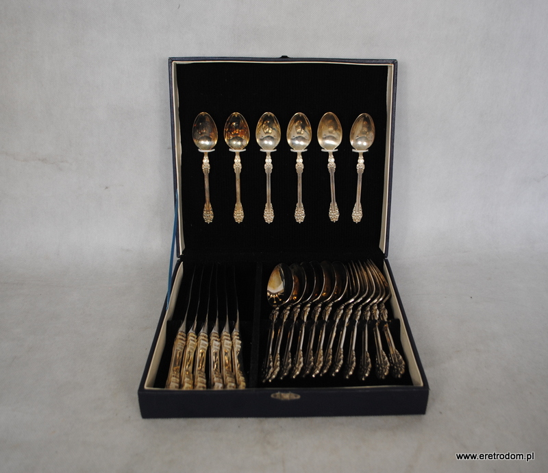 Zestaw sztućców rosyjskiej produkcji (MHU). Metal platerowany srebrem. W skład wchodzi 6 łyżek obiadowych, 6 widelców, 6 noży oraz 6 łyżeczek deserowych. Całość w oryginalnej kasecie.