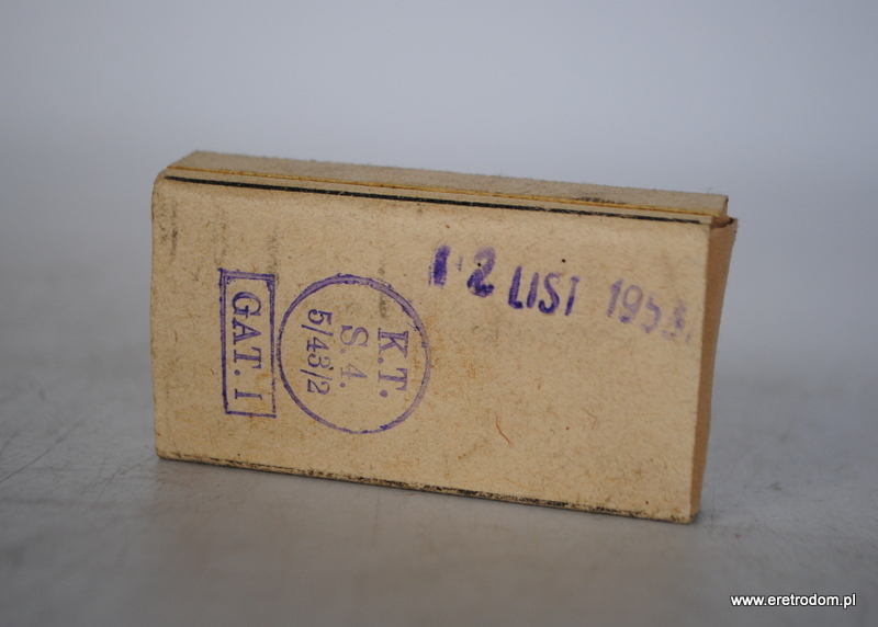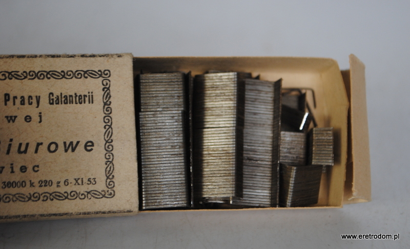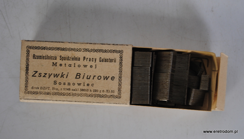 Rzemieślnicza Spółdzielnia Pracy Galanterii Metalowej Sosnowiec zszywki biurowe. Całość w tekturowym opakowaniu.