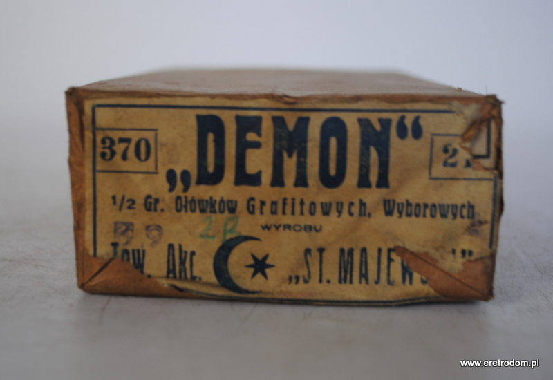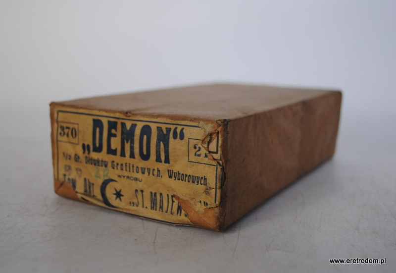 Stanisław Majewski, I poł. XXw. Opakowanie zbiorcze ołówków Demon. Twardość 2B. W środku 6 opakowań, w każdym 12 ołówków. Całość zamknięta, nigdy nie otwierana. Rzadkość.