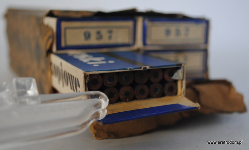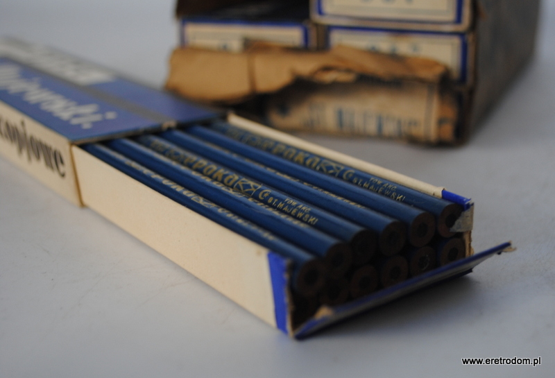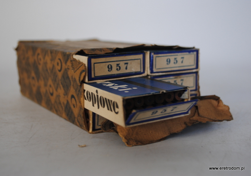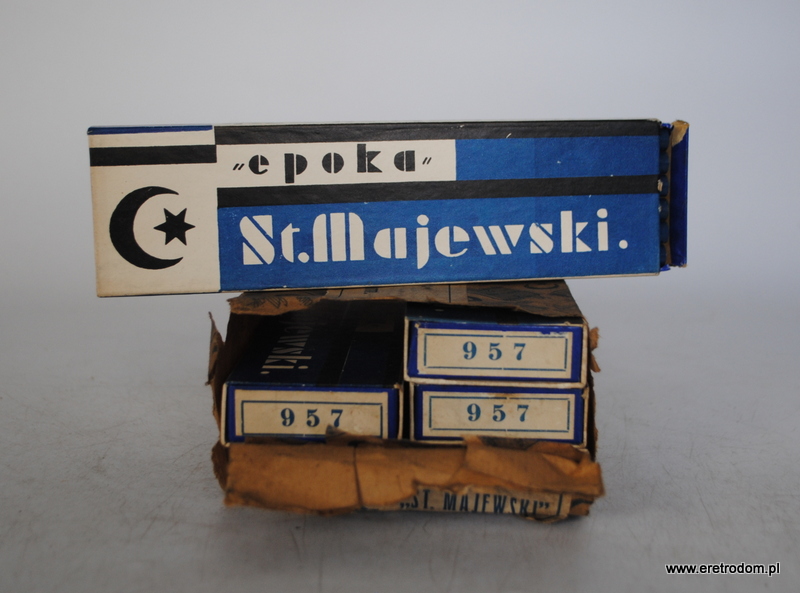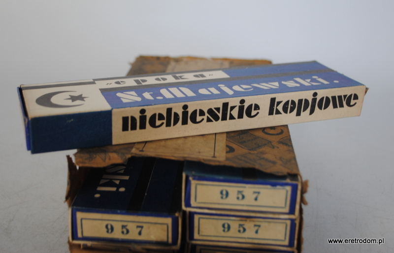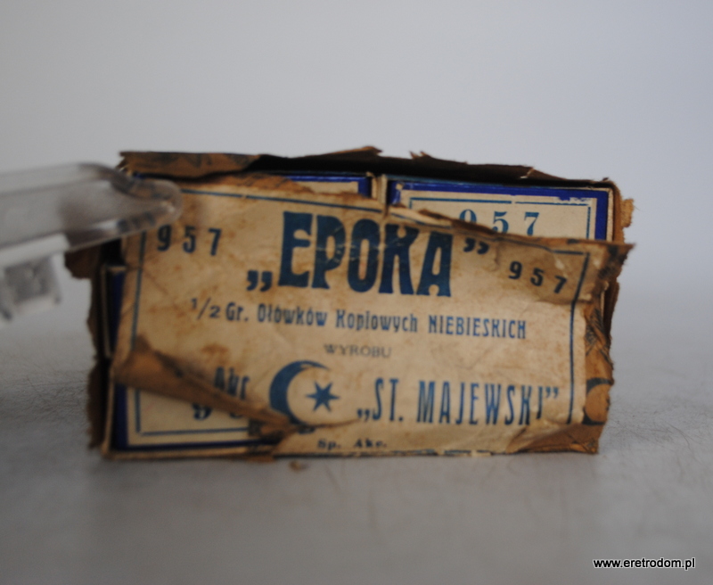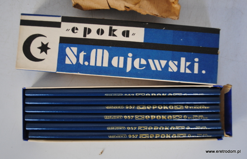 Opakowanie zbiorcze firmy Stanisława Majewskiego. W środku 6 tekturowych opakowań ołówków kopiowych niebieskich nr 957. W każdym opakowaniu 12 ołówków „Epoka”. Rzadkość.