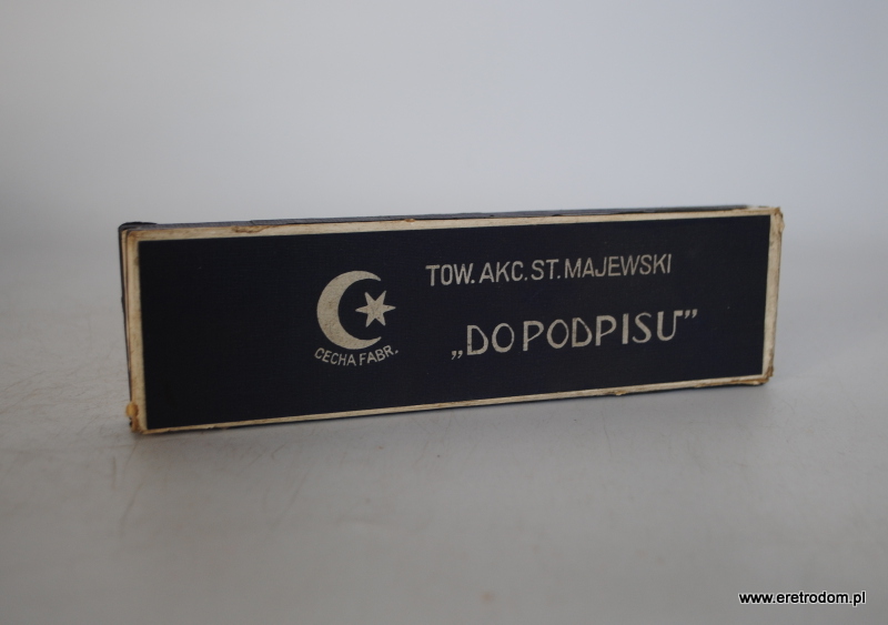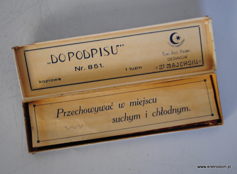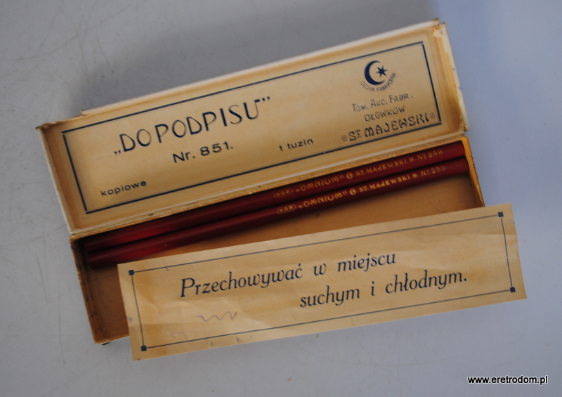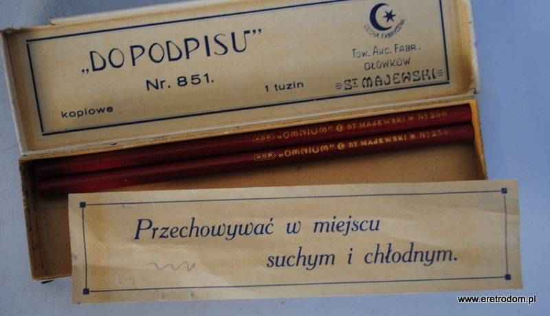 Opakowanie wraz z dwoma kredkami firmy Stanisław Majewski. i poł. XXw. Opakowanie „Do podpisu” , kredki czerwone „Omnium”.