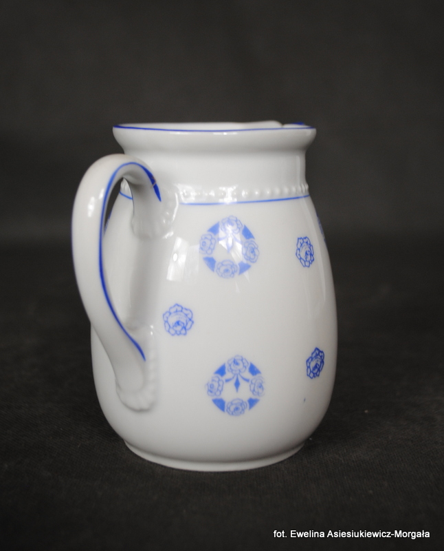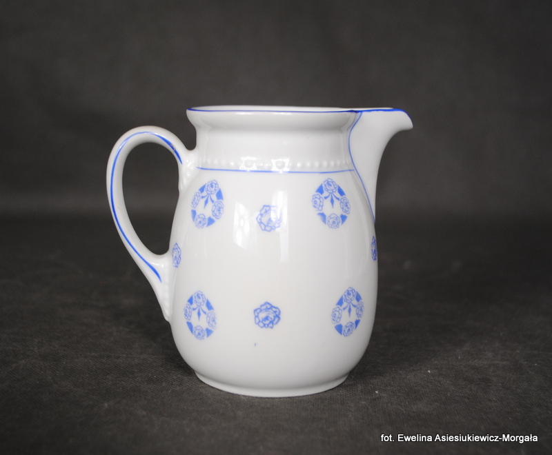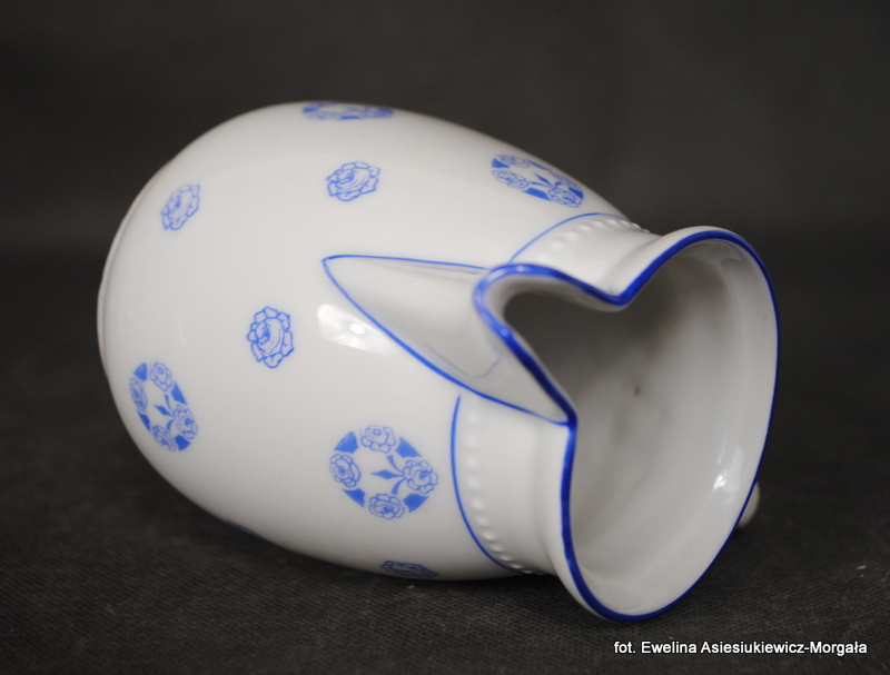 Mlecznik sygnowany Stanowice koło Strzegomia (I poł. XXw.). Biała porcelana malowana na niebiesko.