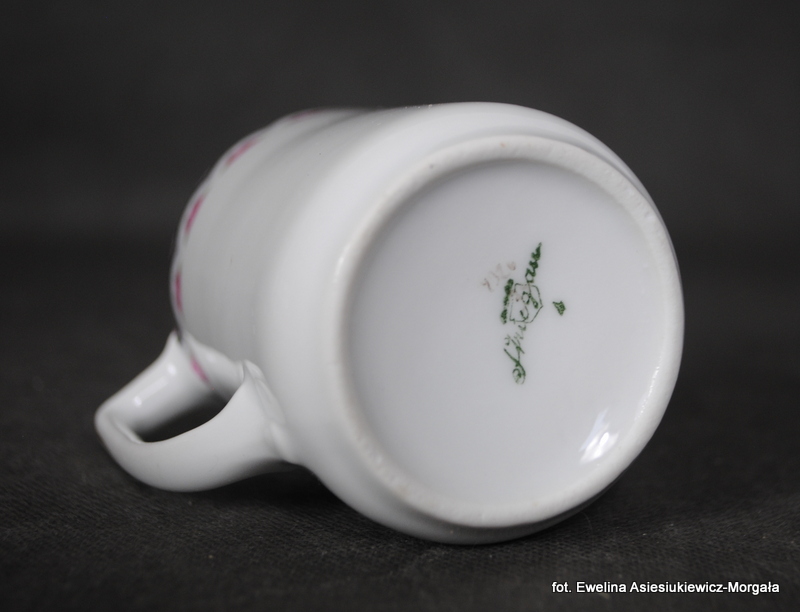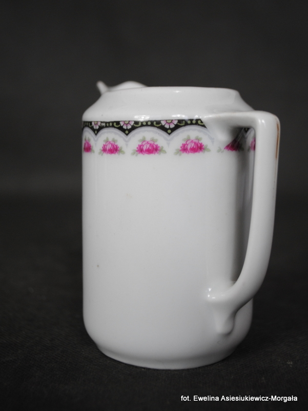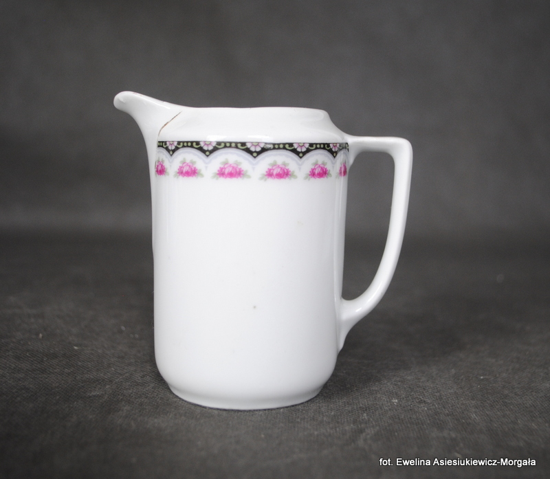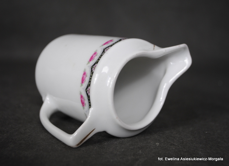 Mlecznik sygnowany Stanowice koło Strzegomia ( I poł. XXw.). Biała porcelana ozdobiona szlaczkiem przy rancie.