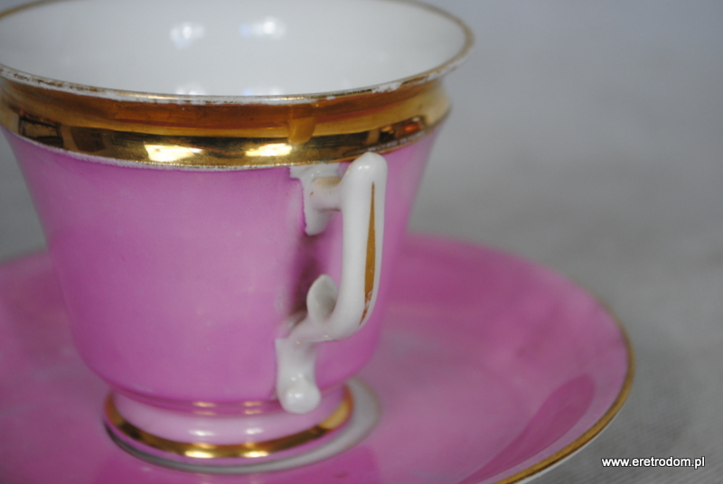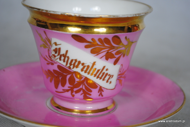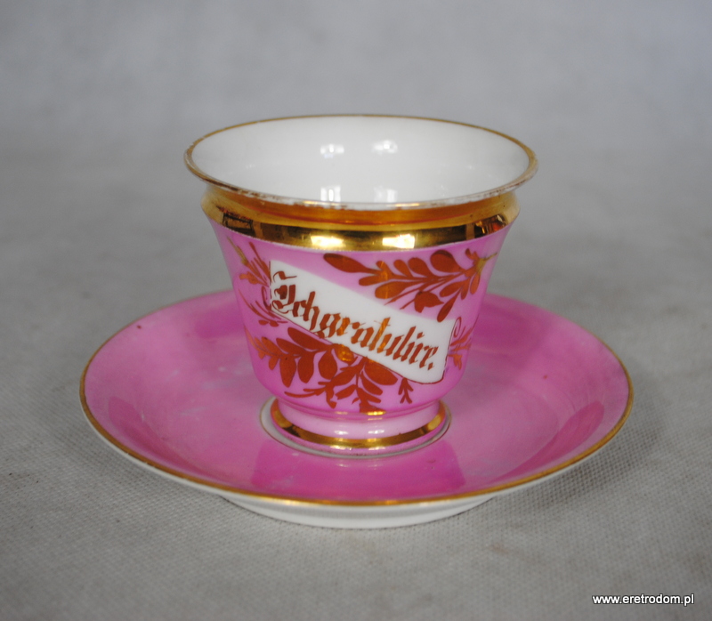 Filiżanka ze spodkiem. Spodek sygnowany Stanowice Strzegom, filiżanka Wałbrzych Stary Zdrój. Najprawdopodobniej malowana w prywatnej malarni w latach 1882-1890r. Biała porcelana malowana na kolor pudrowego różu, ranty złocone. W centralnej części złoty napis „Ich Gratulire” (Gratuluję).
