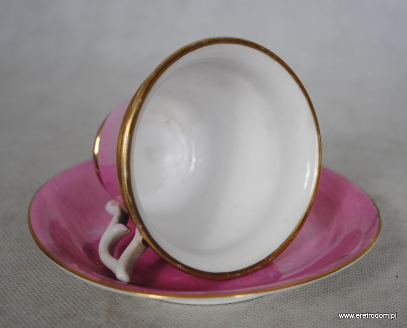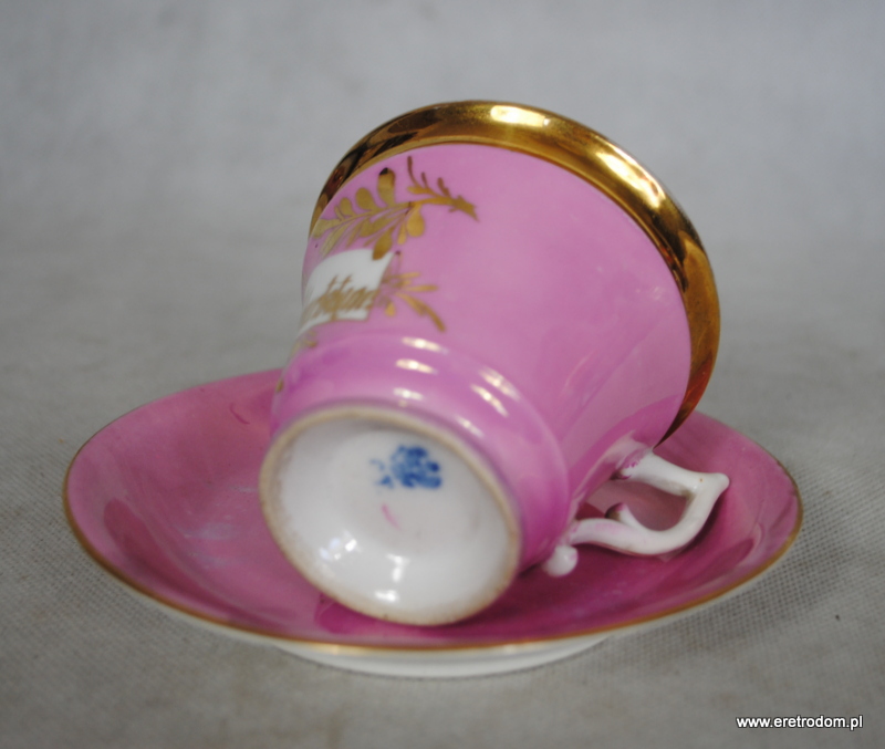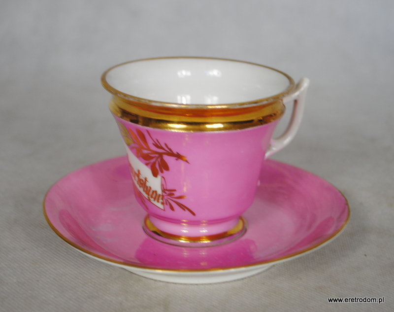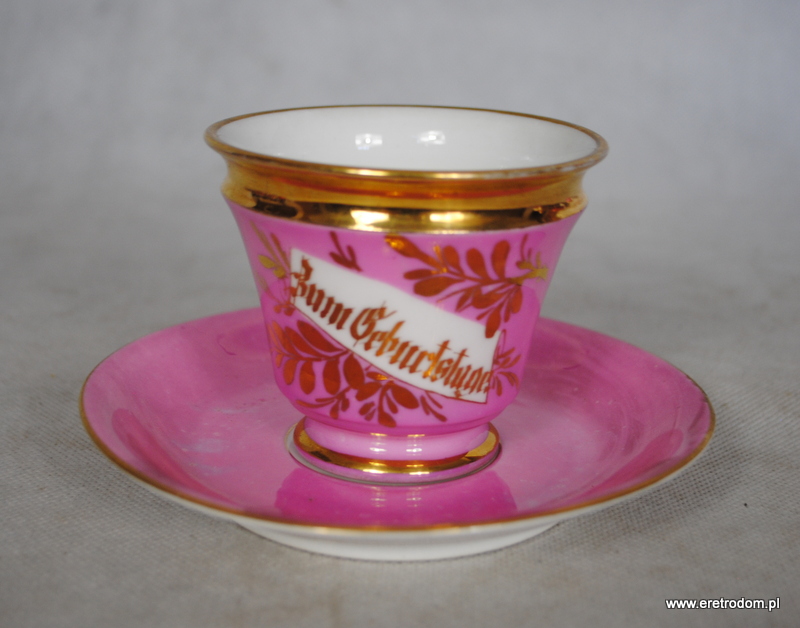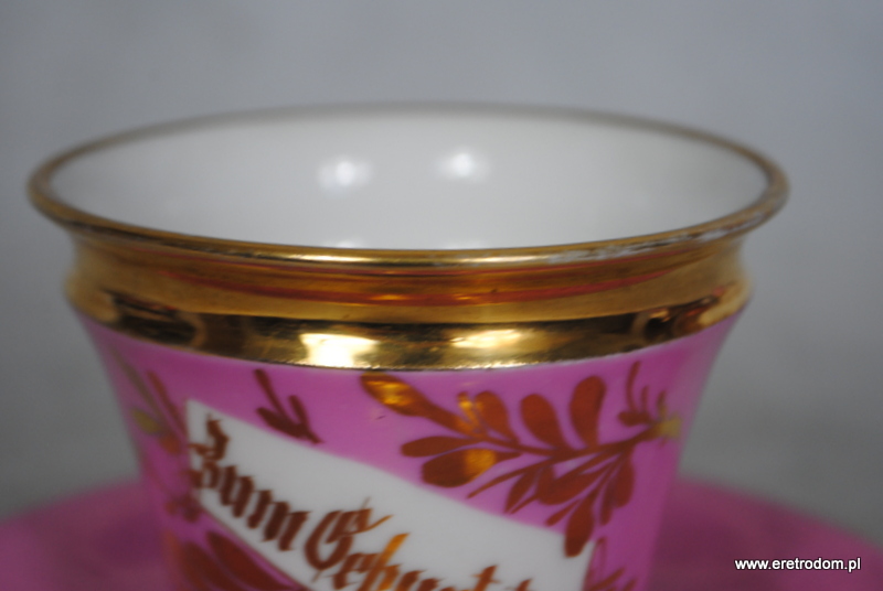 Filiżanka ze spodkiem. Spodek sygnowany Stanowice Strzegom, filiżanka Wałbrzych Stary Zdrój. Najprawdopodobniej malowana w prywatnej malarni w latach 1882-1890r. Biała porcelana malowana na kolor pudrowego różu, ranty złocone. W centralnej części złoty napis „Zum Geburtstage” (Na urodziny).