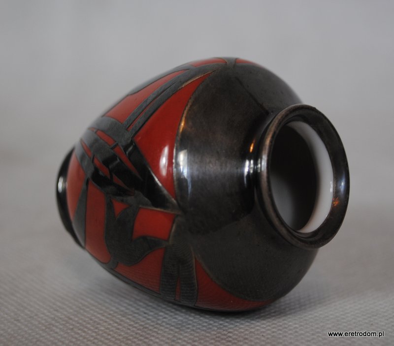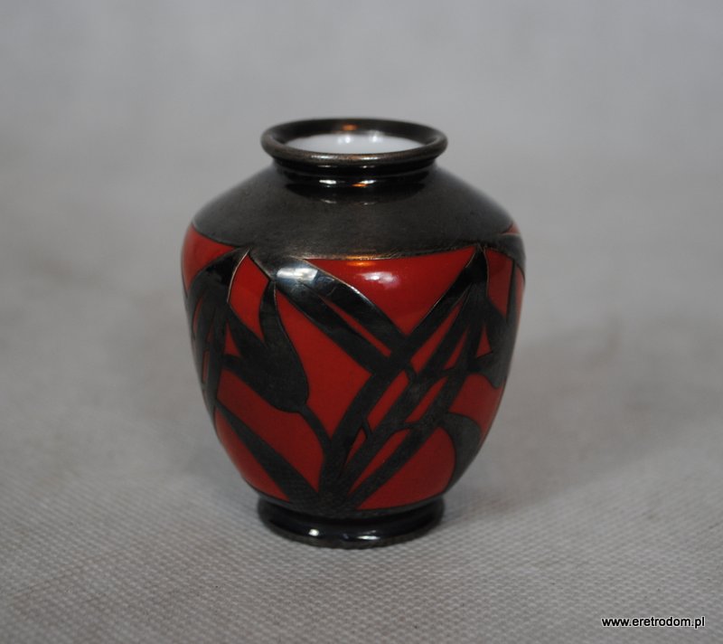 Stareńki wazonik wykonany w I poł. XXw. Biała porcelana malowana oraz srebrzona. Os spodu sygnatura numeryczna.