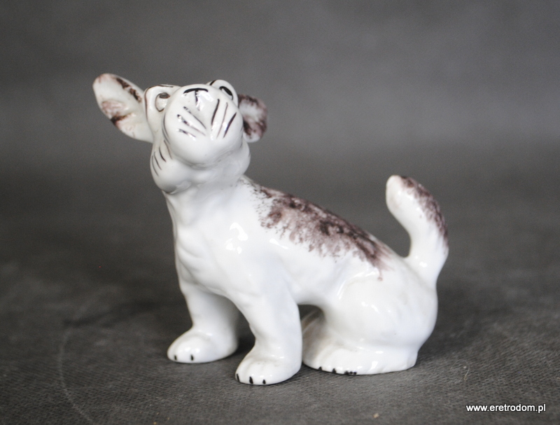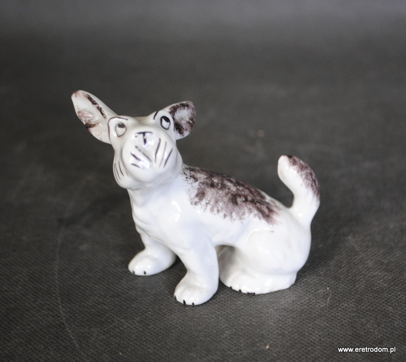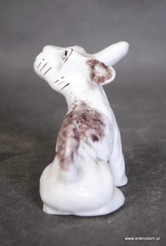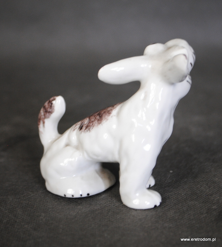 Figurka przedstawiająca pieska. Wyprodukowana najprawdopodobniej w jednej ze śląskich manufaktur w I poł. XXw. Biała porcelana, ręcznie malowana.