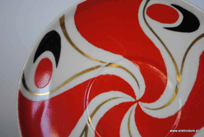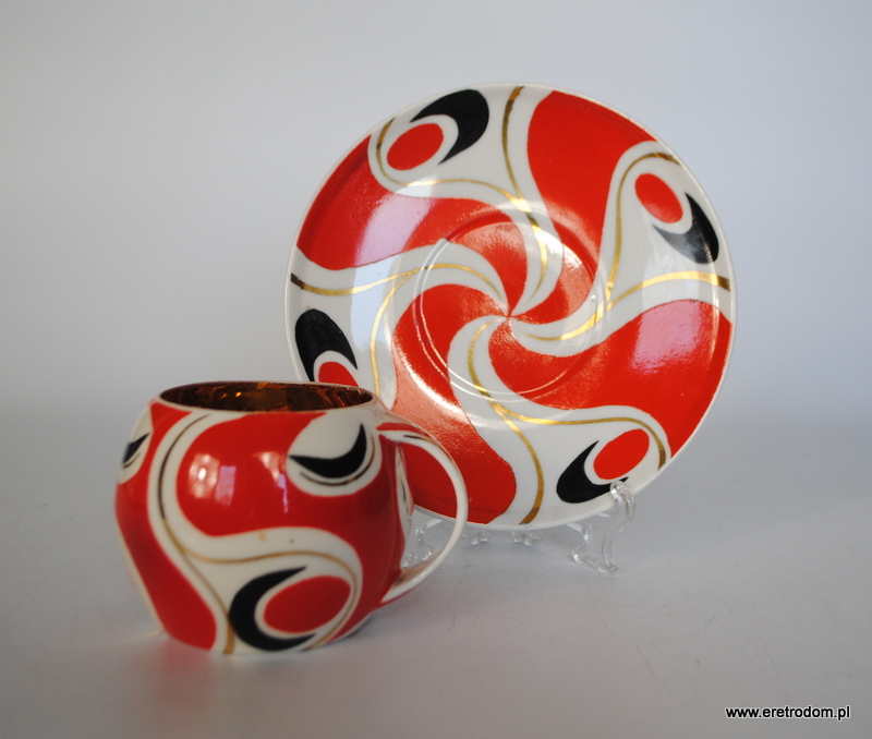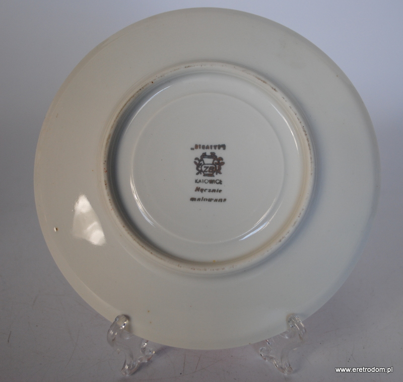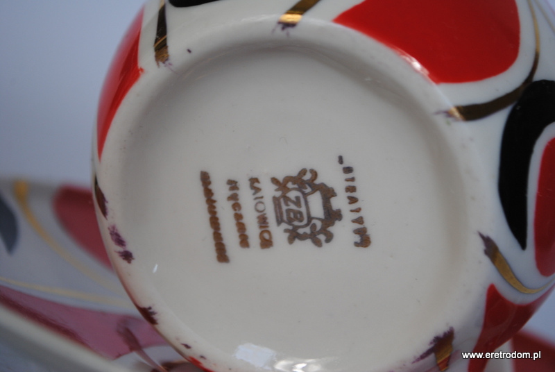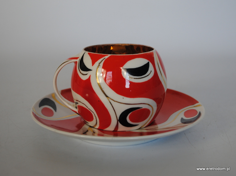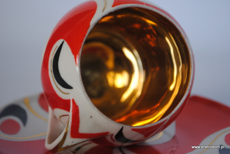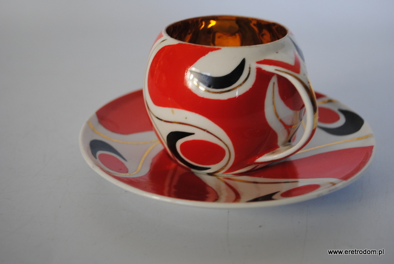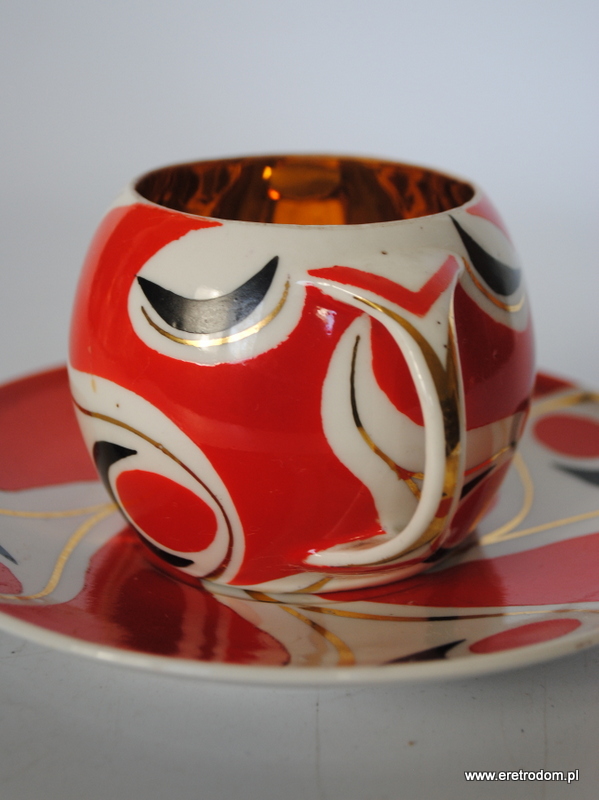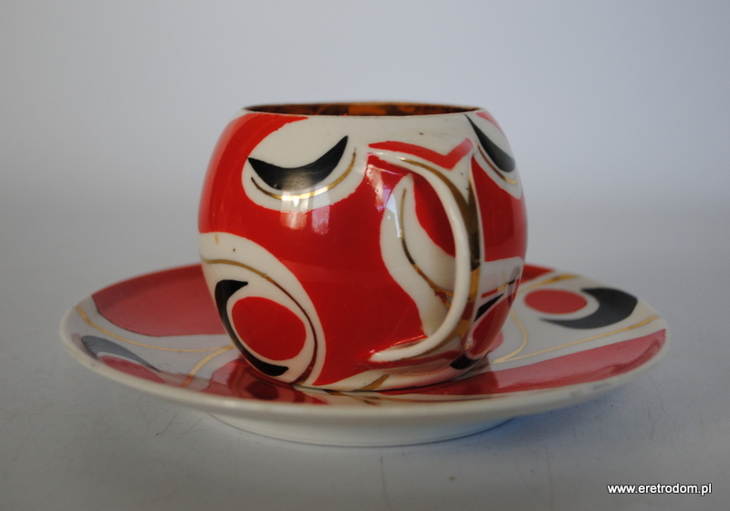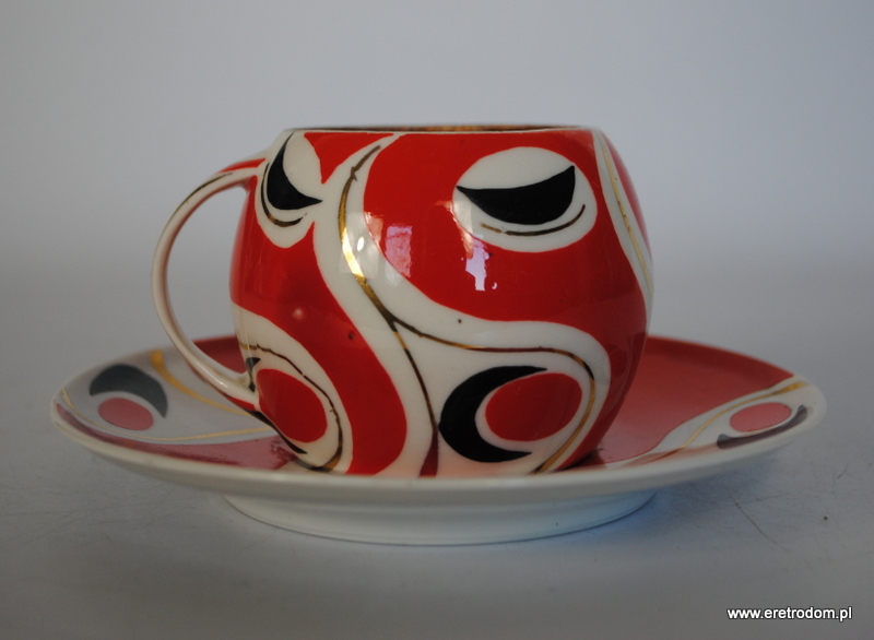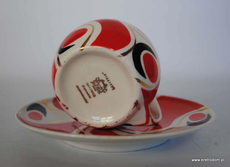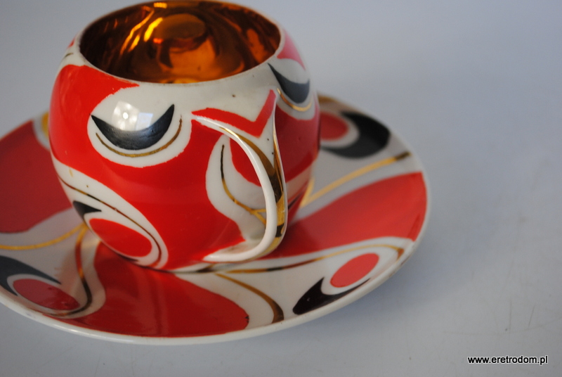 Filiżanka ze spodkiem. Steatyt Katowice, II poł. XXw. Biała porcelana ręcznie malowana. Filiżanka w środku złocona.