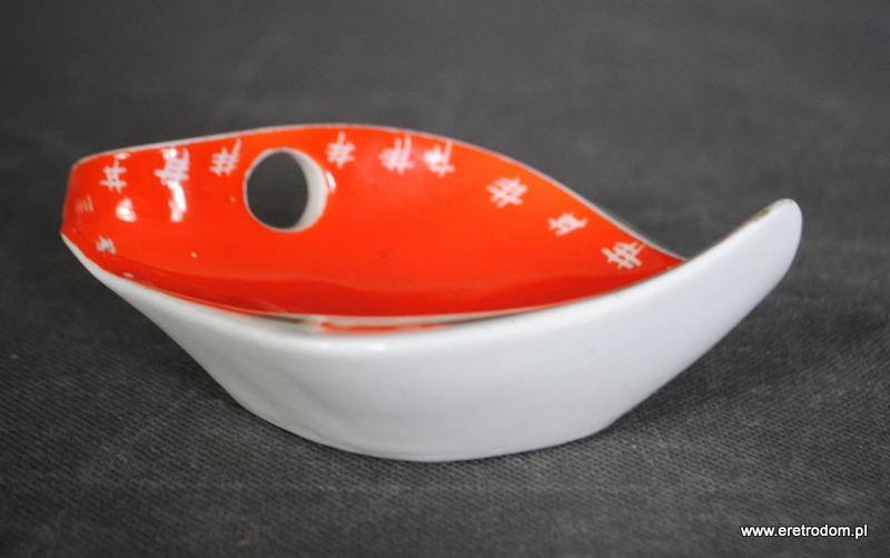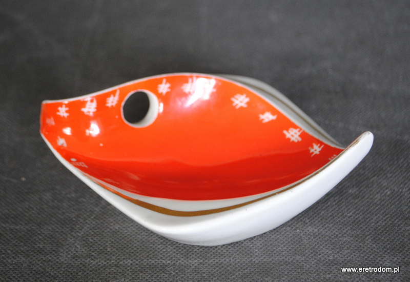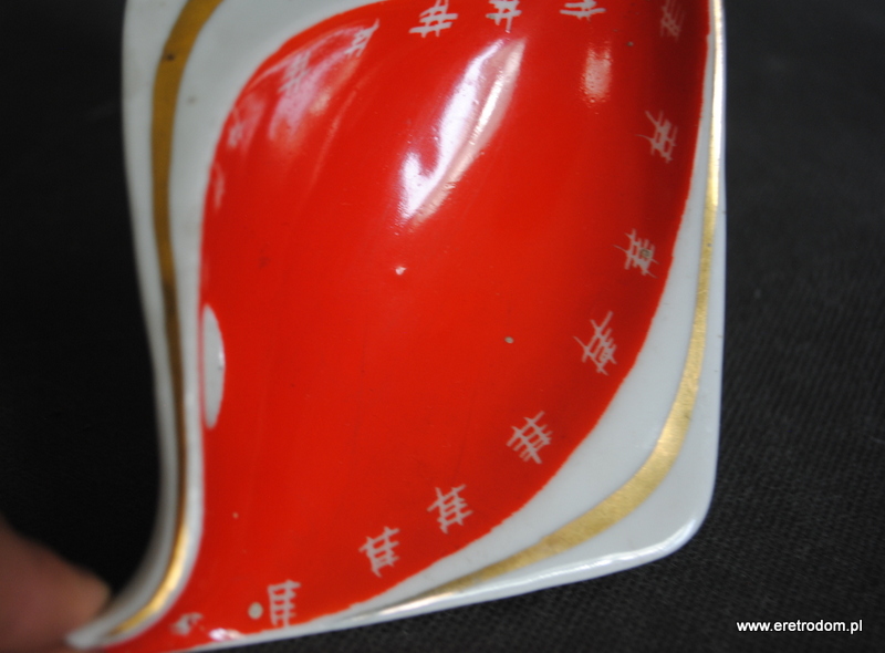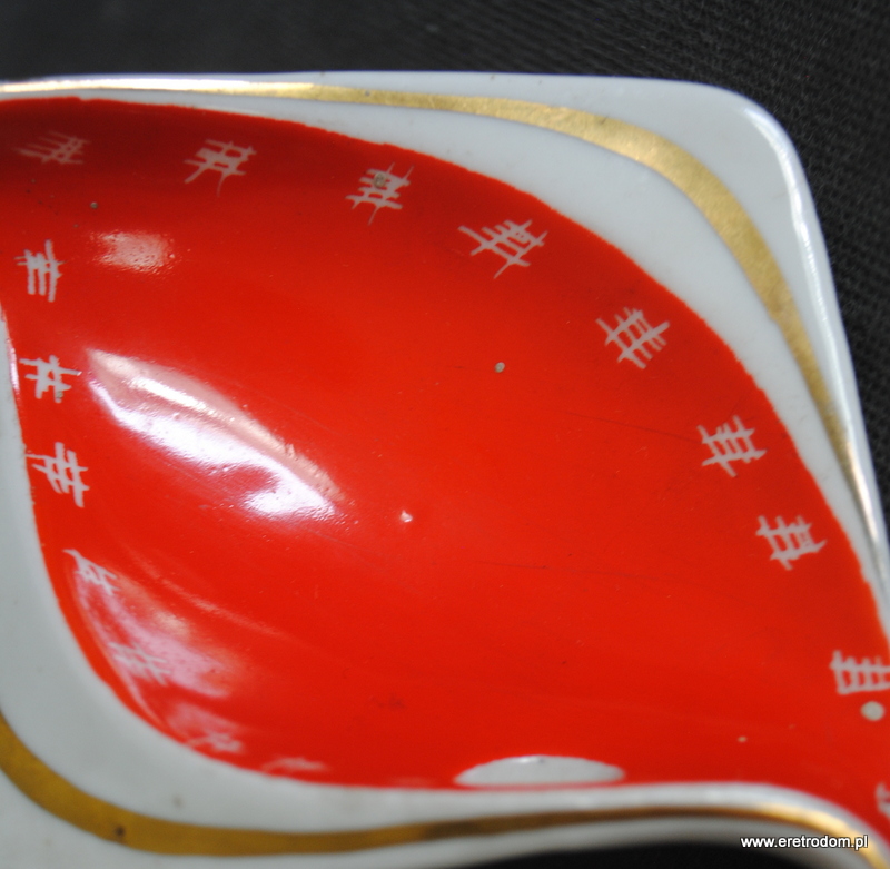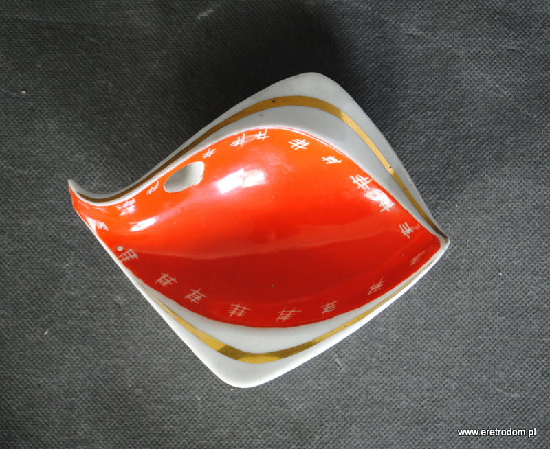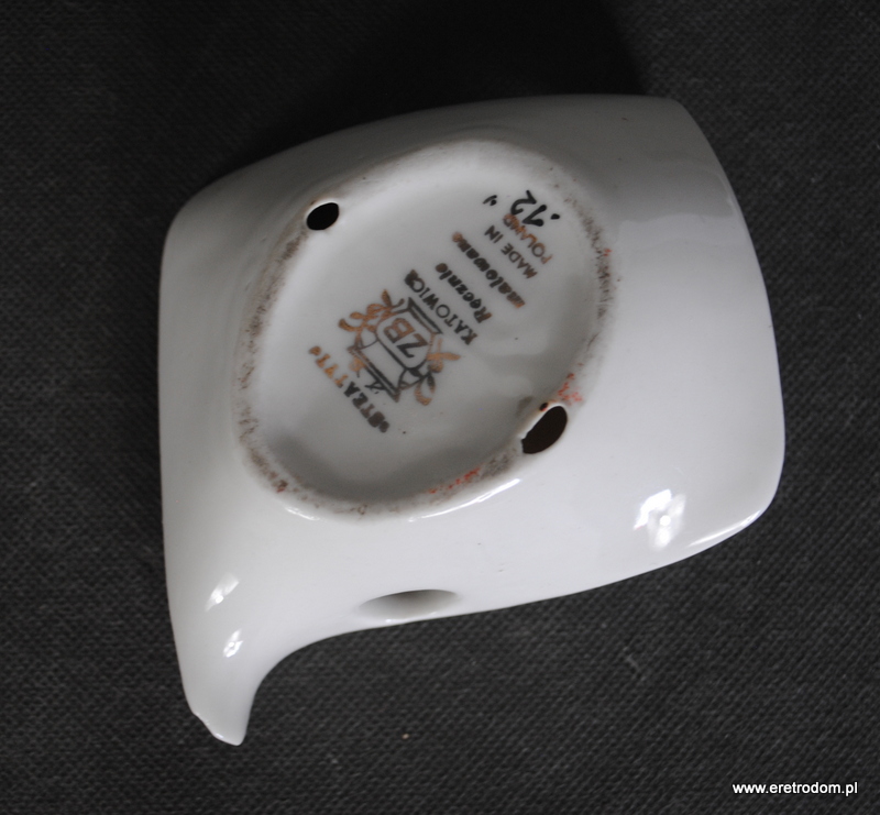 Popielniczka sygnowana Steatyt Katowice. Biała porcelana malowana natryskowo, wybierana, złocona.