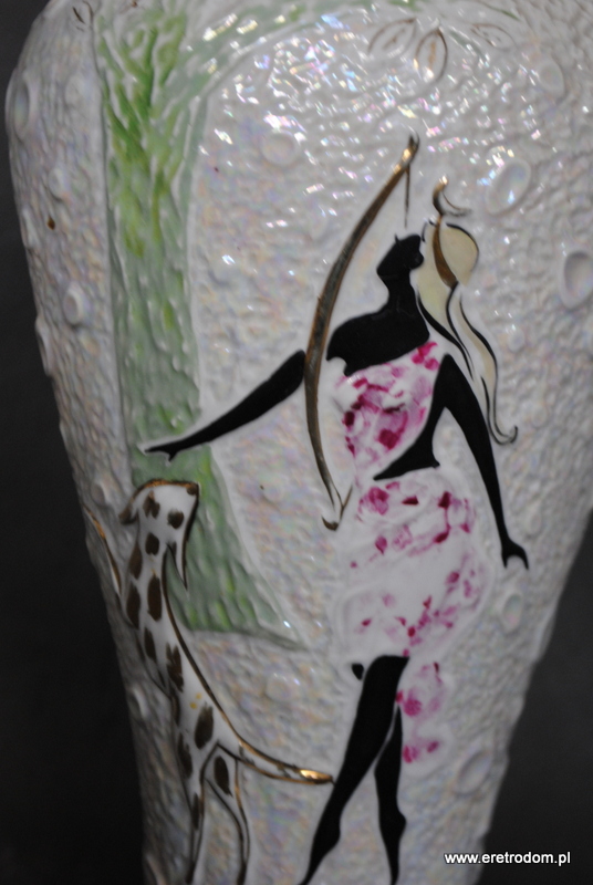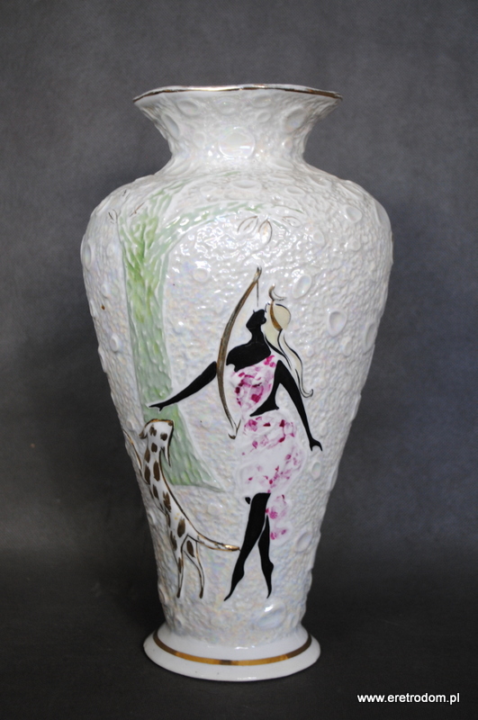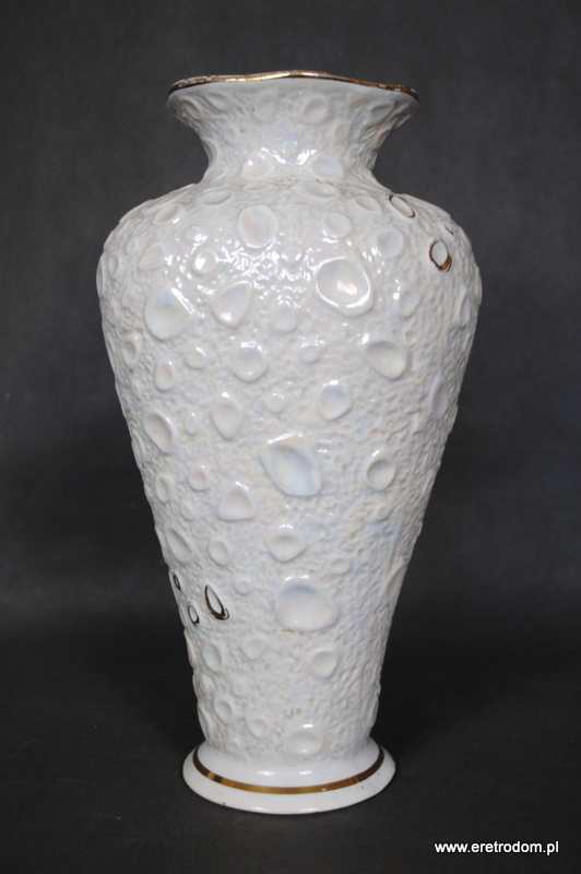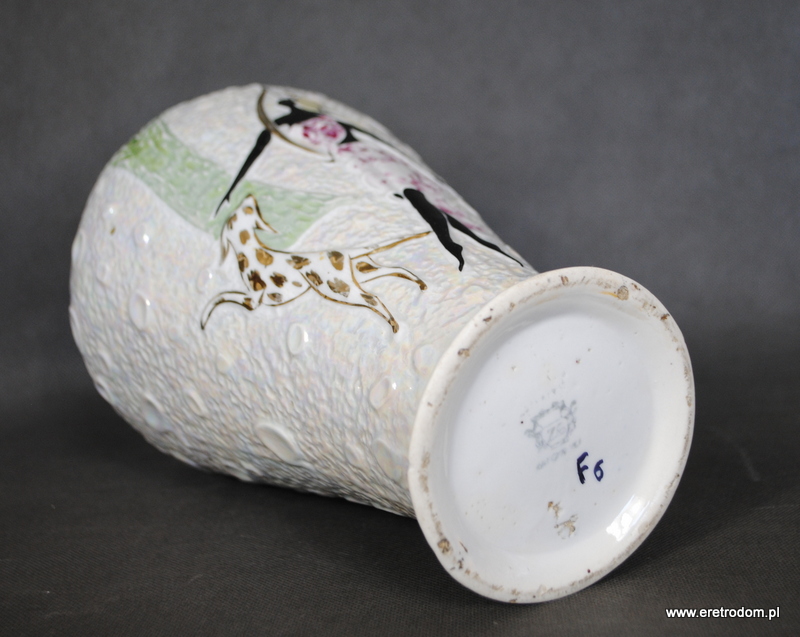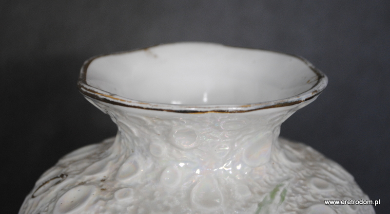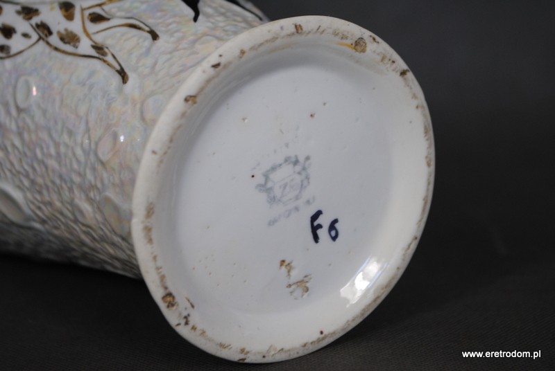 Wazon wyprodukowany w wytwórni Zygmunta Buuksowicza Steatyt Katowice. Biała dość gruba porcelana zdobiona w typowy dla wytwórni sposób.