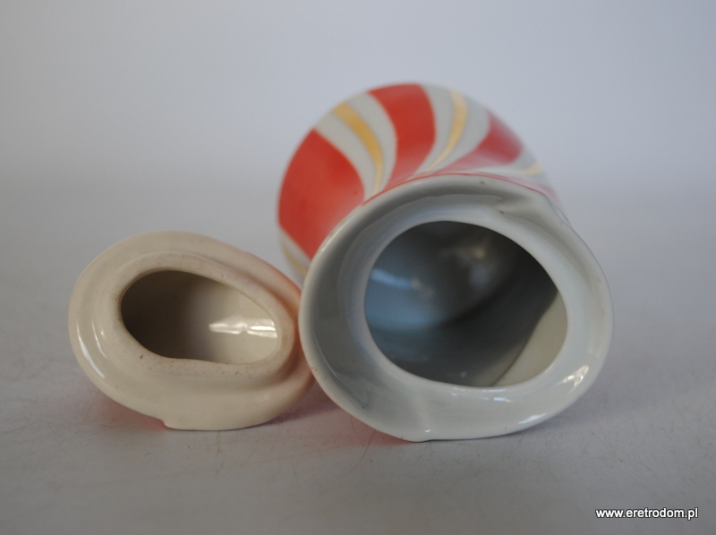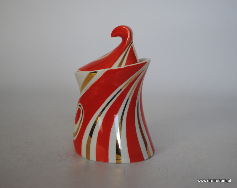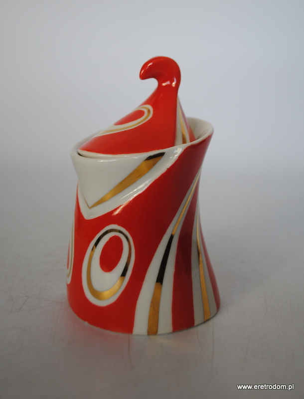 Cukiernica z serwisu do kawy Kakadu. Steatyt Katowice, II poł. XXw. Biała porcelana malowana natryskowo, złocona.