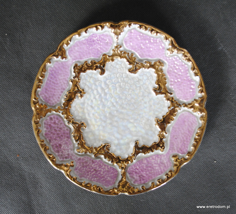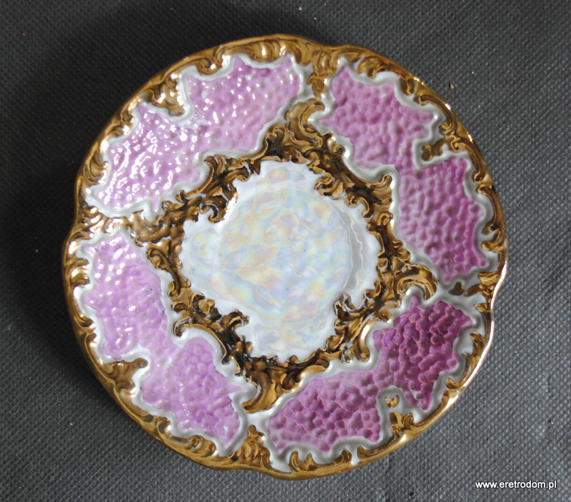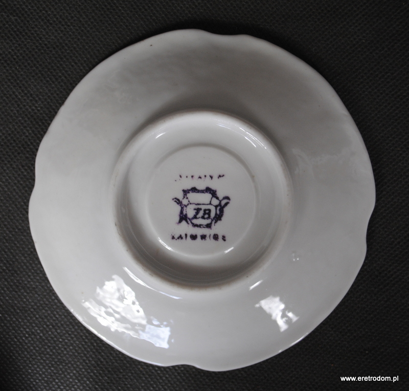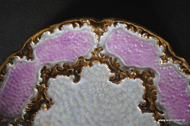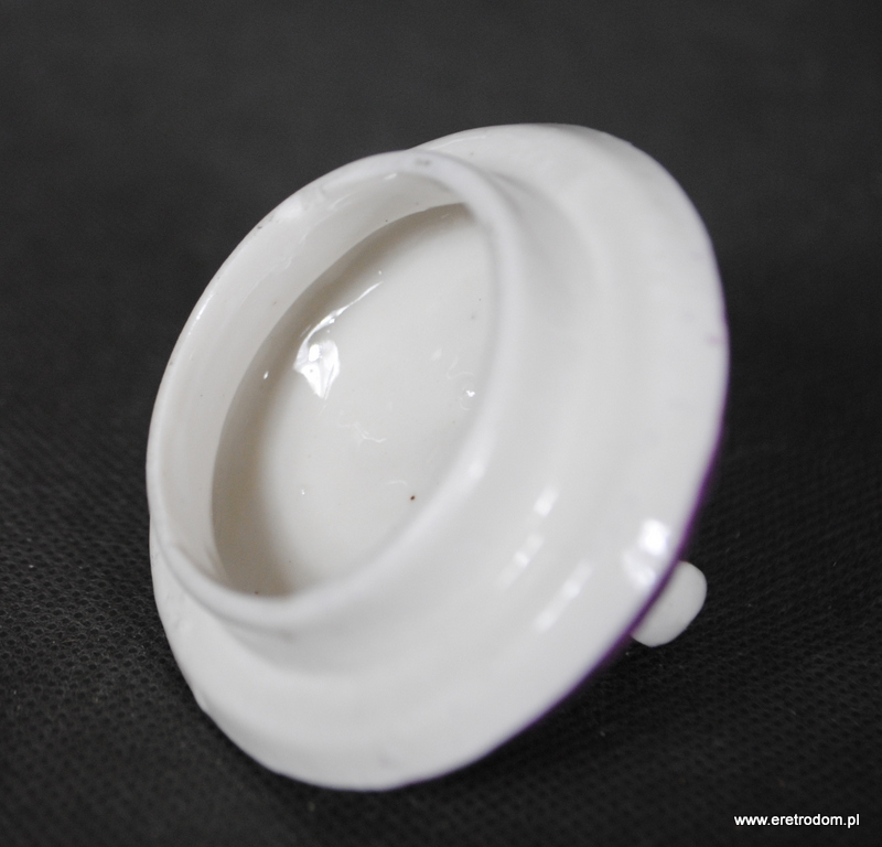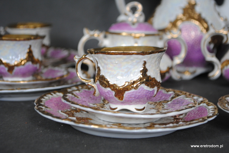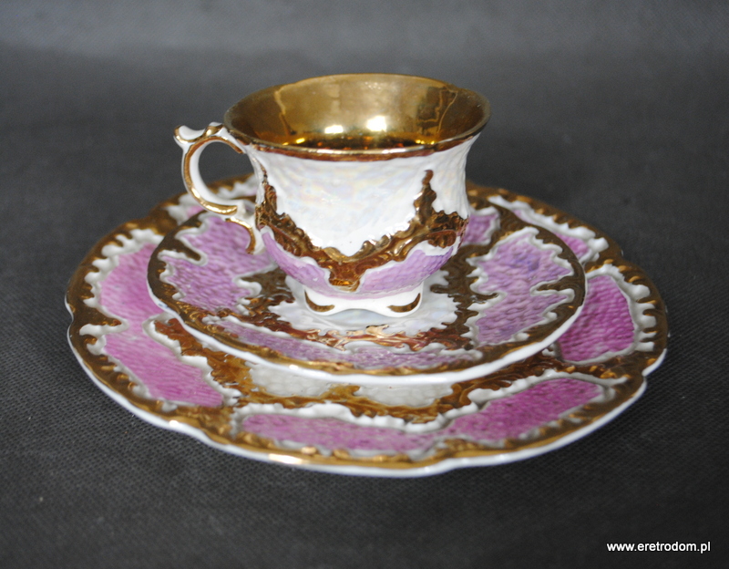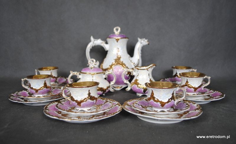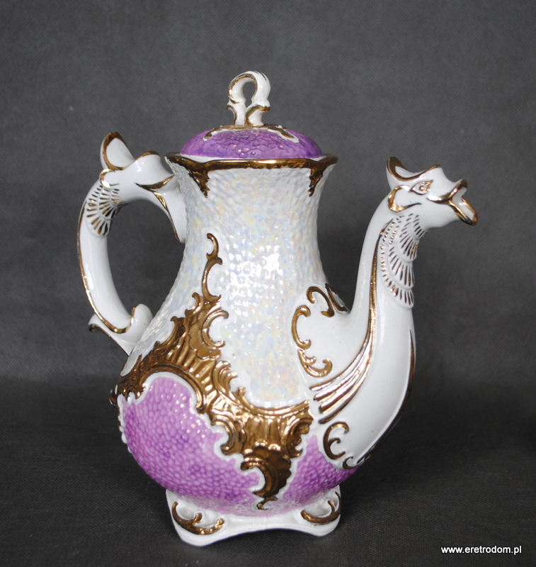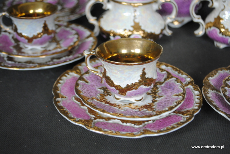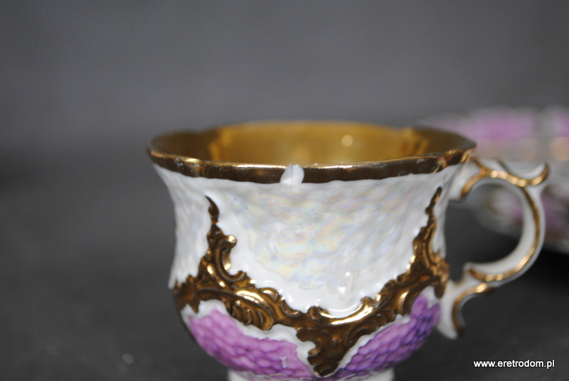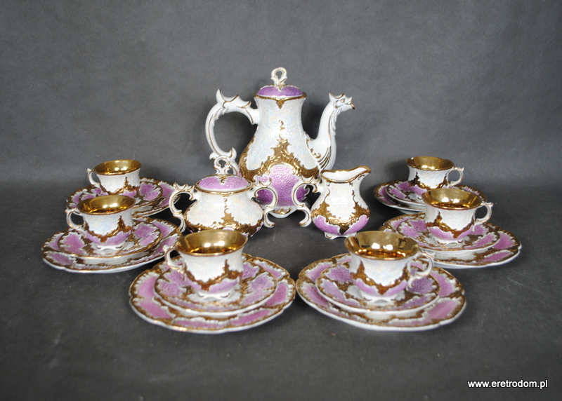 Zestaw do kawy sygnowany Steatyt Katowice nazywany Smoczym (II poł XXw.). Biała, dość gruba porcelana ręcznie malowana na ciekawy jasno fioletowy kolor złocona.