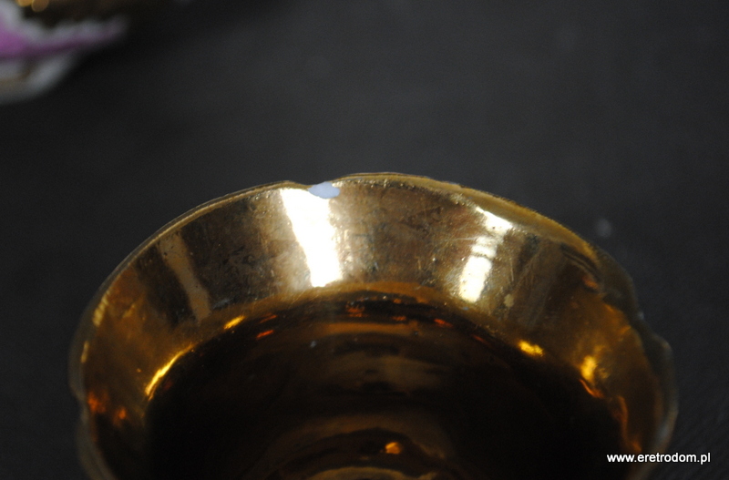 Stan dobry. Na dwóch filiżankach występuje odprysk przy rancie (na jednej również spękanie). Pod przykrywką odprysk na wewnętrznym rancie.