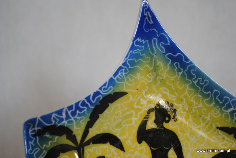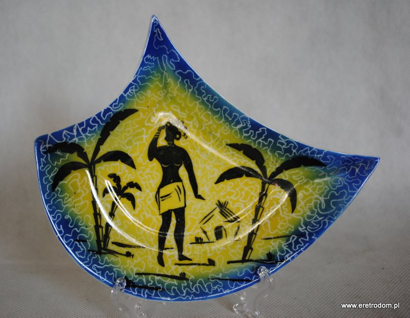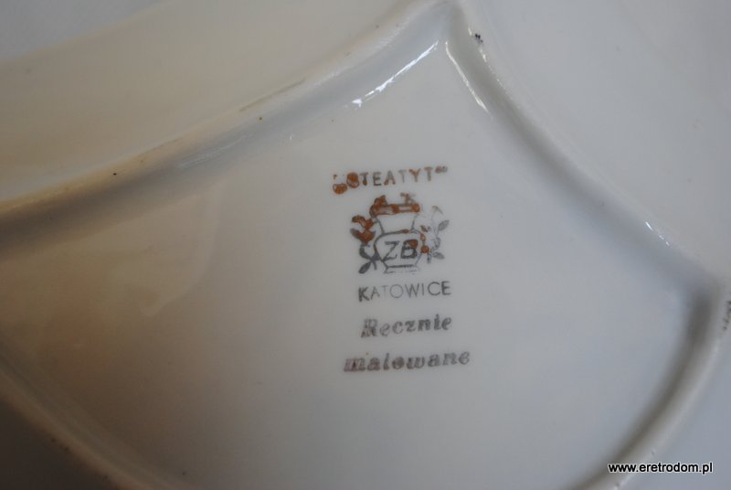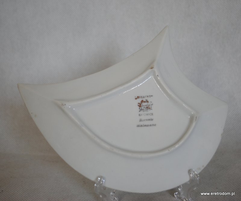 Talerzyk deserowy, produkcja Steatyt Katowice. II poł XXw. Pochodzi z serwisu ” Murzynek”. Biała porcelana malowana natryskowo, rant wybierany. Czarne motywy malowane ręcznie.