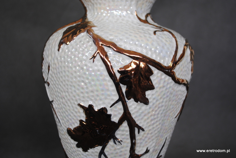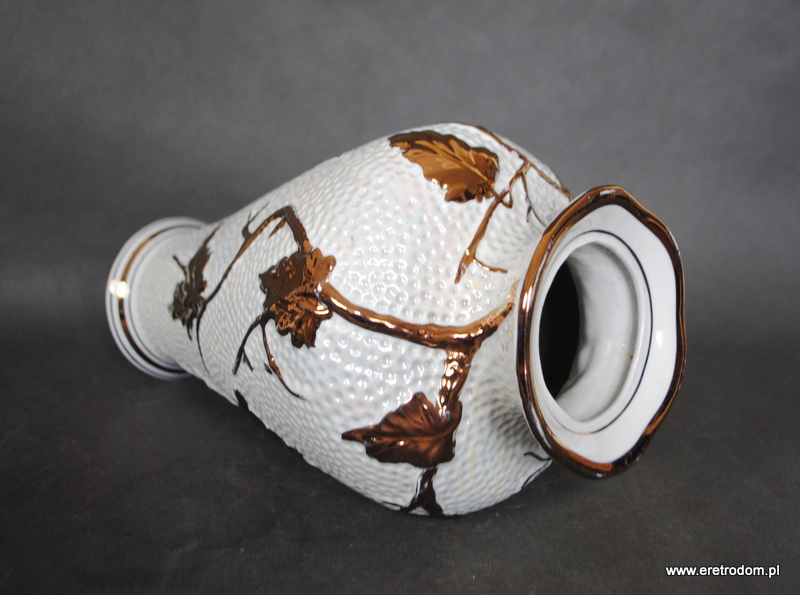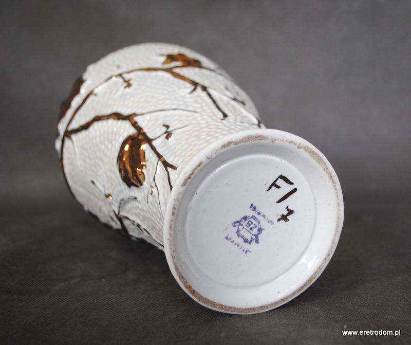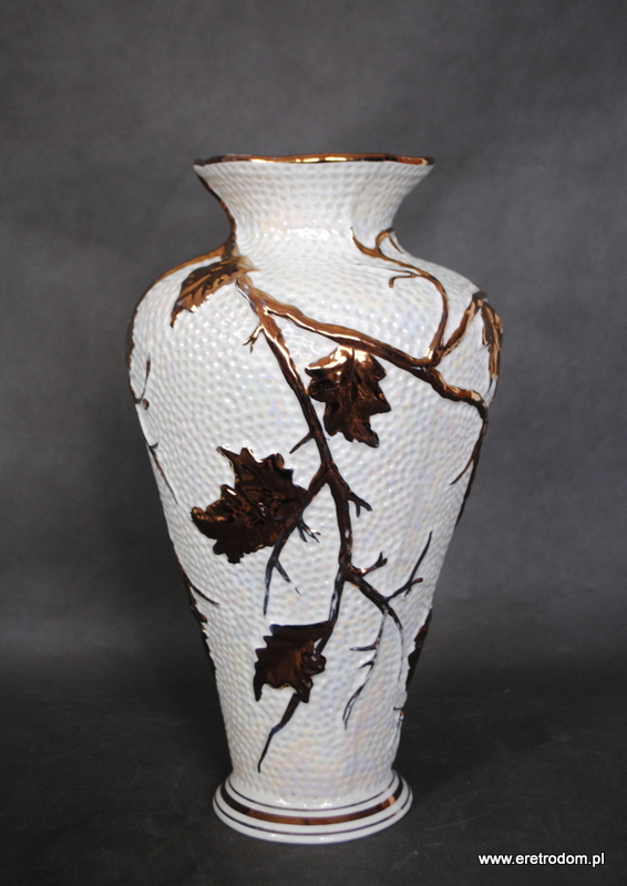 Wazon sygnowany Steatyt Katowice. Wyprodukowany w II poł. XXw. Biała, dość gruba porcelana ozdobiona plastycznym motywem liści, złocony.