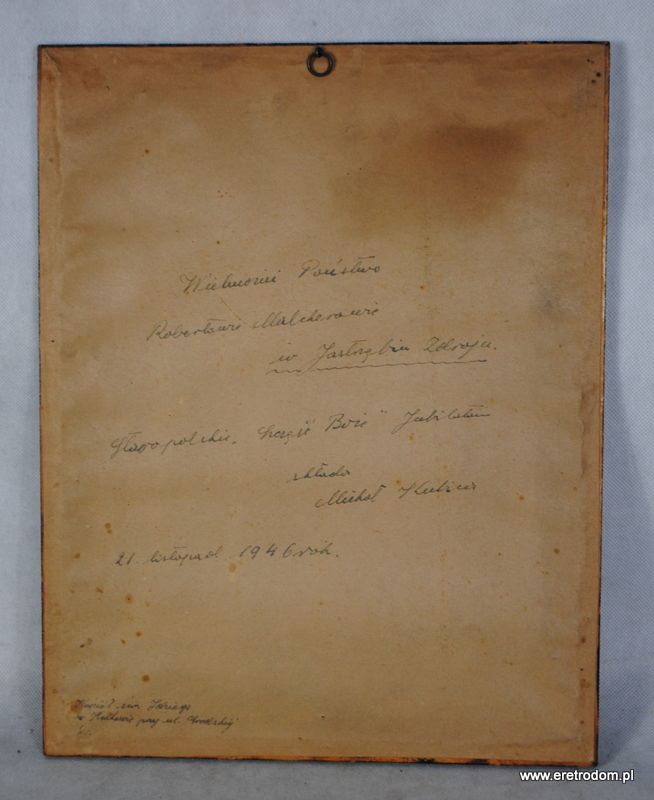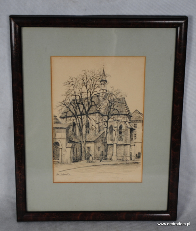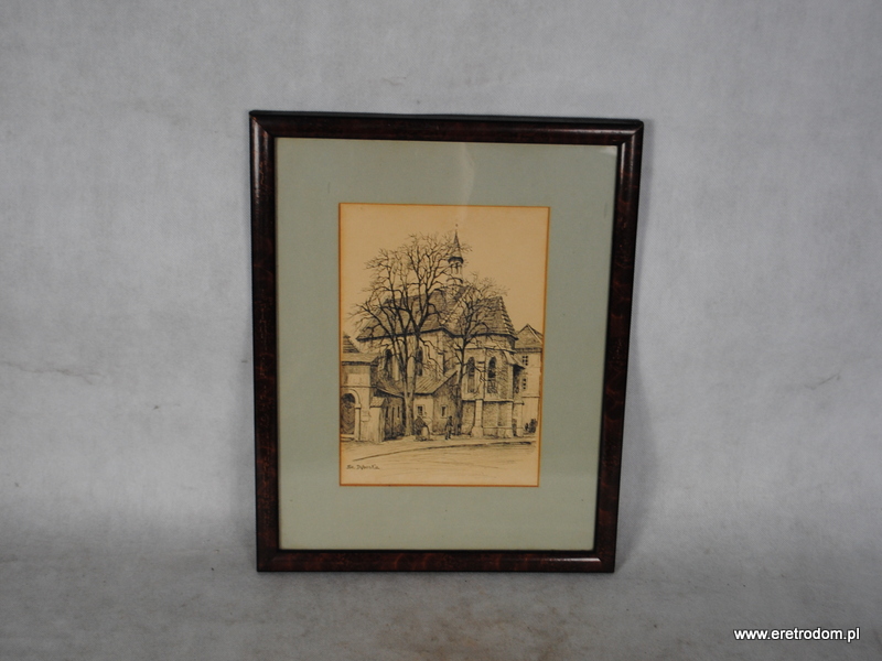 Stefania Dyboska, Kościół Św. Idziego w Krakwie przy ul. Grodzkiej, akwaforta, 1946 rok. W tylnej części dedykacja. Całość w drewnianej ramie za szkłem.