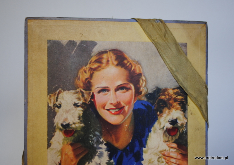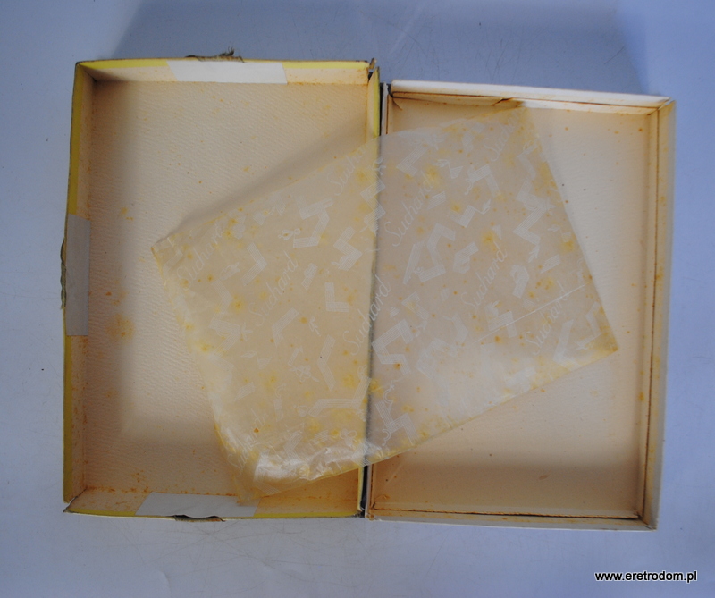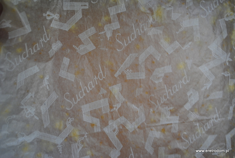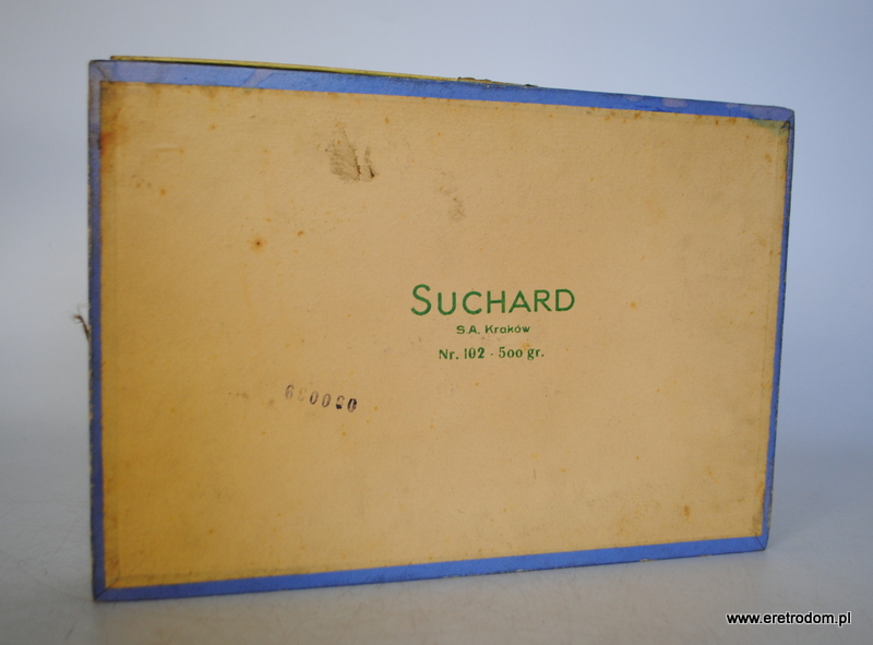Suchard S.A. Kraków, I poł. XXw. Tekturowe opakowanie po czekoladkach. W środku folia ochronna z logiem firmy.