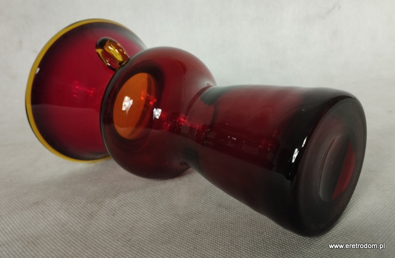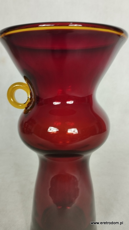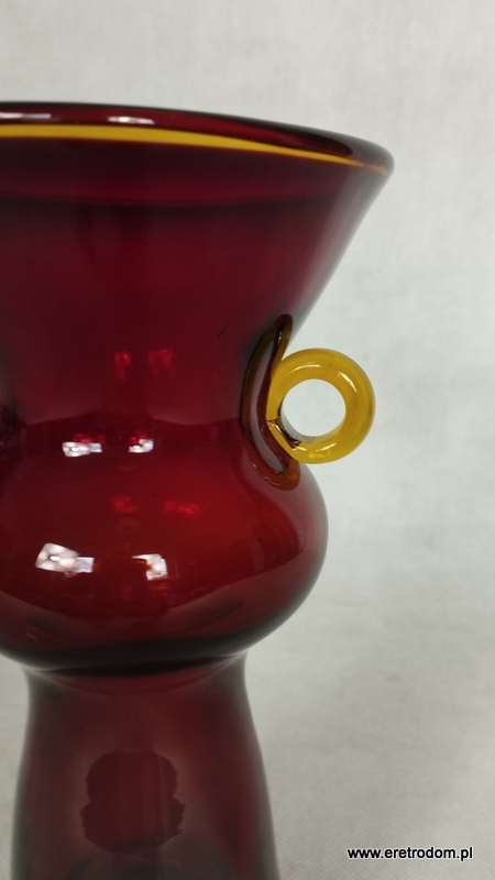Wazon z uchem projektu Kazimierze Krawczyka dla Huty Szkła Sudety. Szkło sodowe, ręcznie formowane, barwione w masie. Rant oraz ucho żółte.