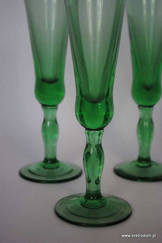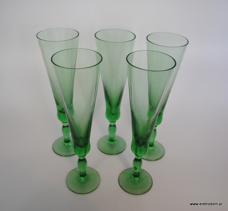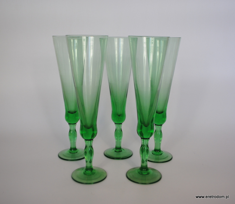 Zestaw 5 kieliszków do szampana (HS Sudety?). Szkło sodowe, barwione w masie na zielony kolor.