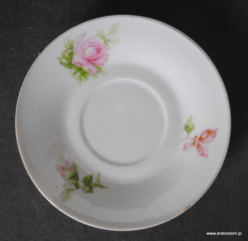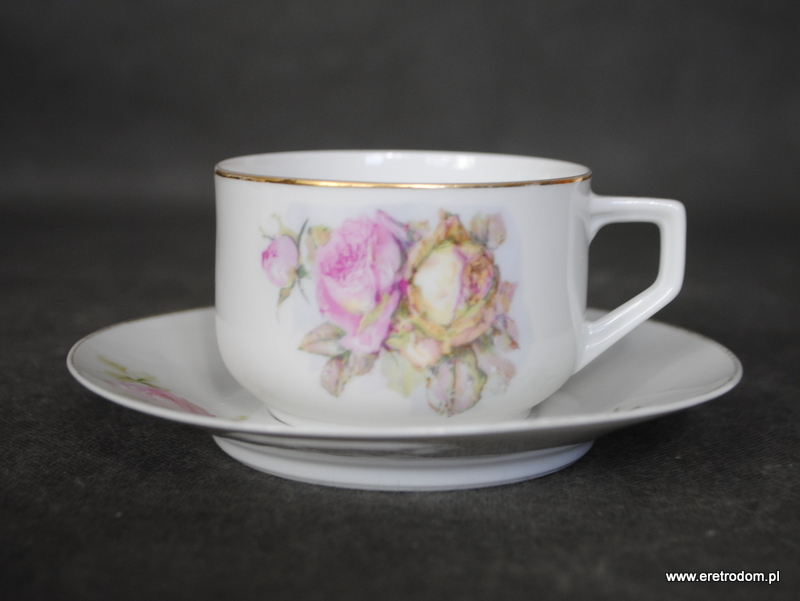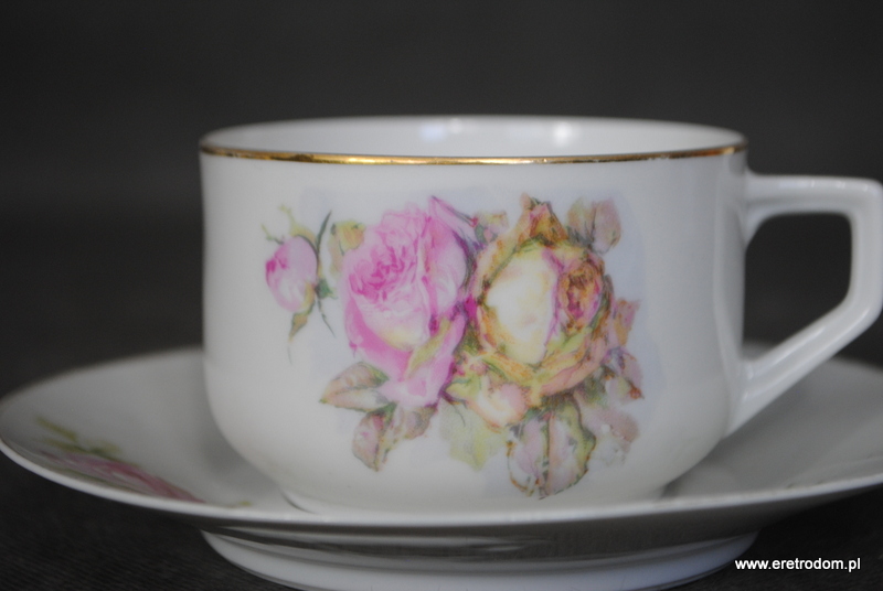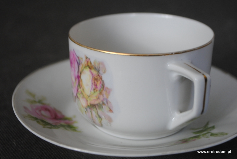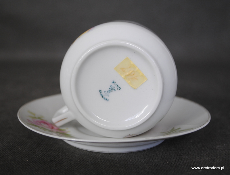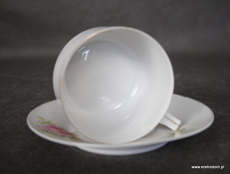 Filiżanka ze spodkiem, Szczawienko Ohme. I poł. XXw. Biała porcelana ozdobiona kwiatową kalką, rant złocony.