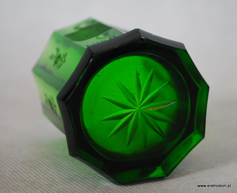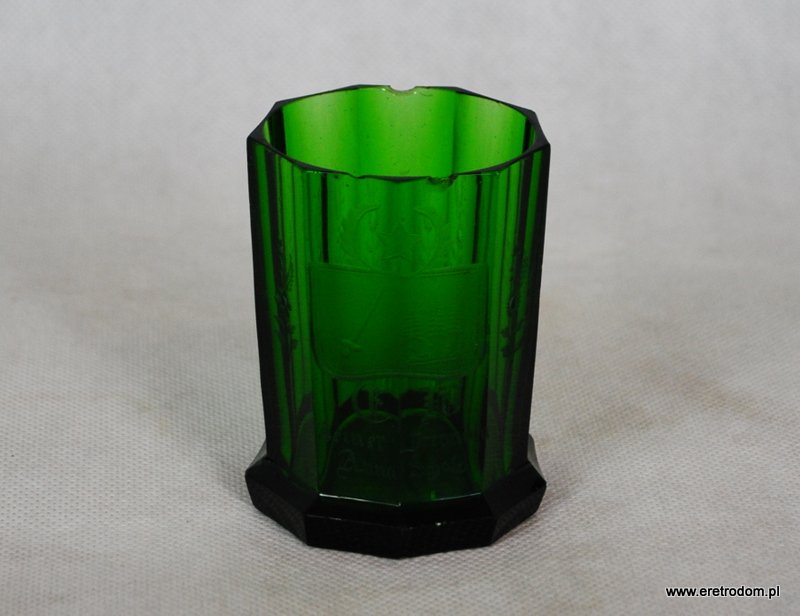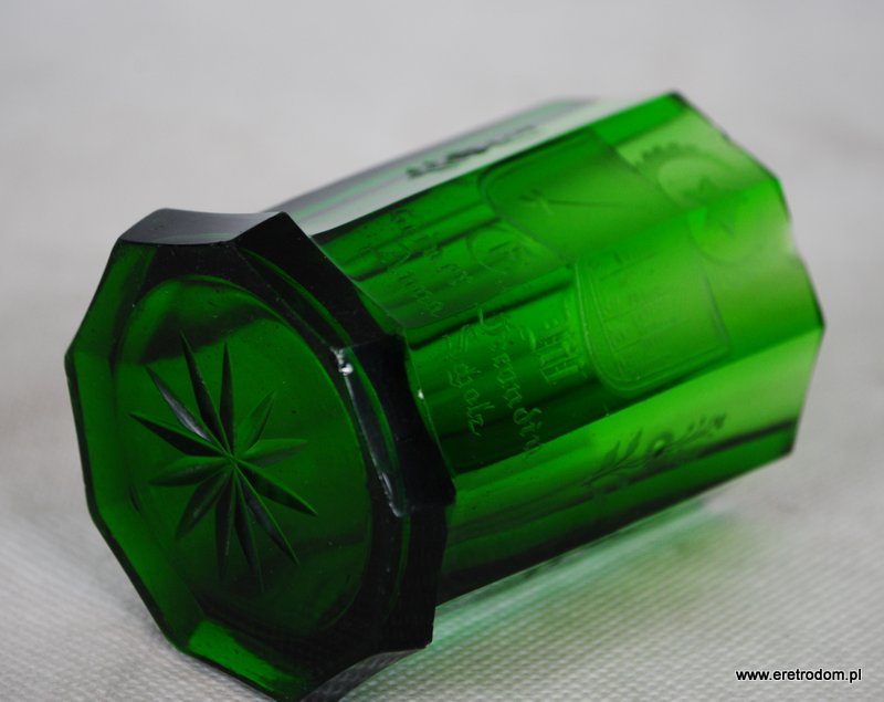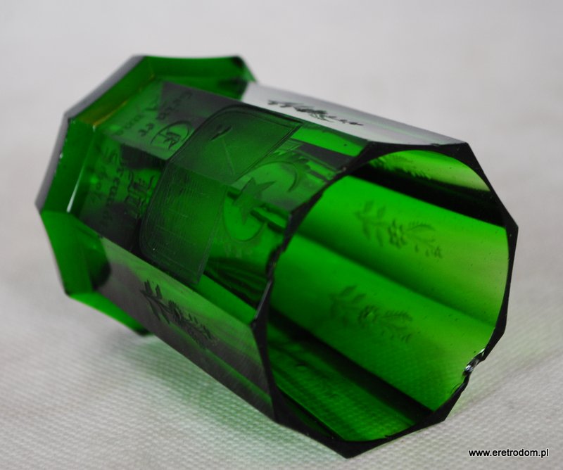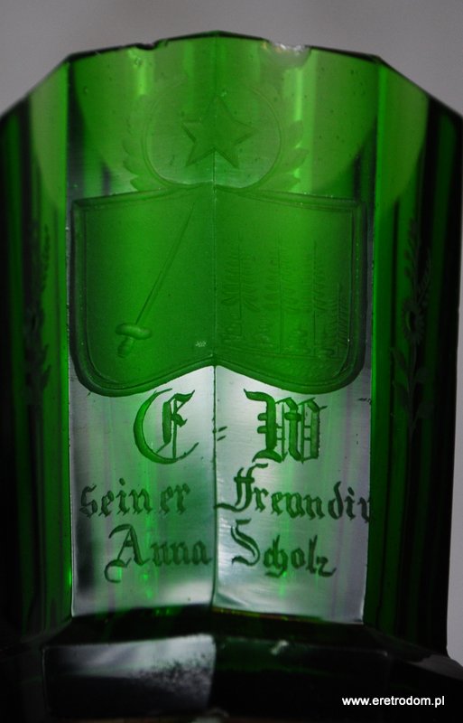 Wazon. Zielone szkło barwione w masie. Posiada bardzo ładny grawer z motywem kwiatowym oraz w centralnej części napis w języku niemieckim.