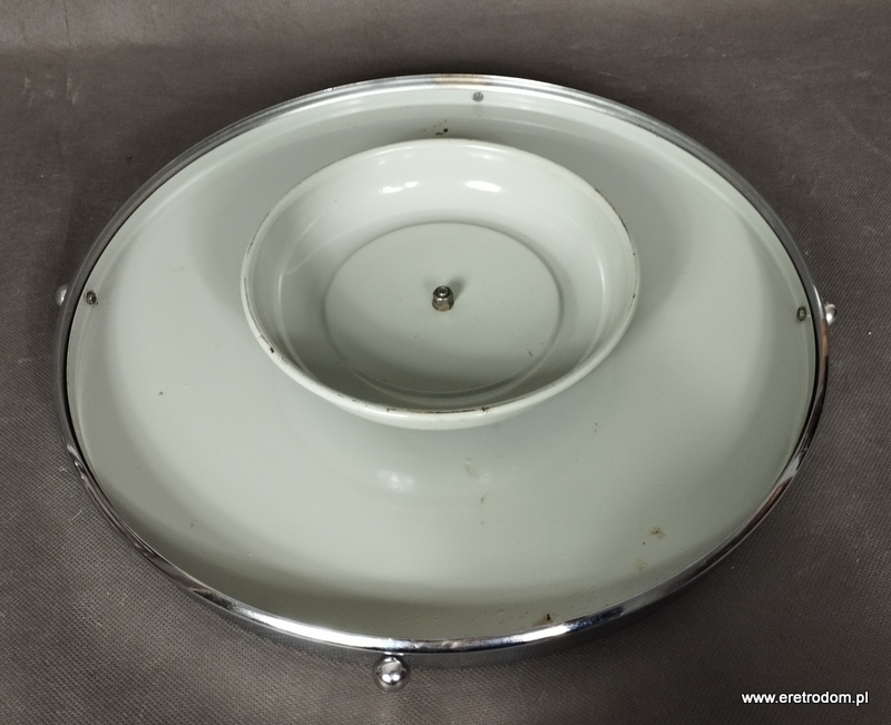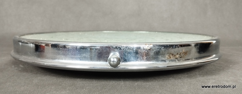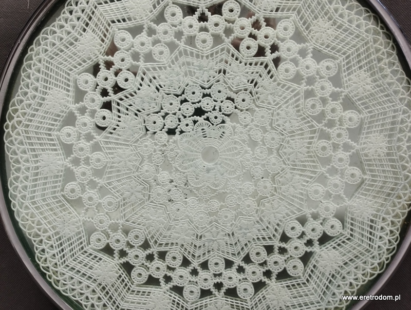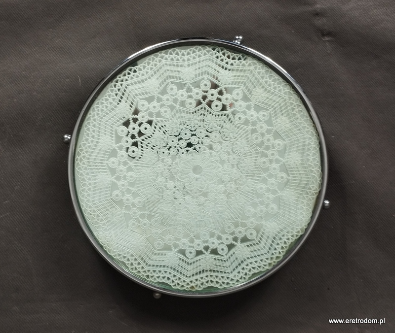 Taca, obrzeże wykonane z metalu, środek szklany. W centralnej części za szkłem umieszczono śliczną koronkę. Całość prezentuje się bardzo ładnie.