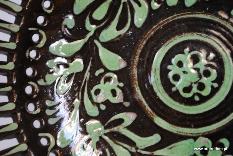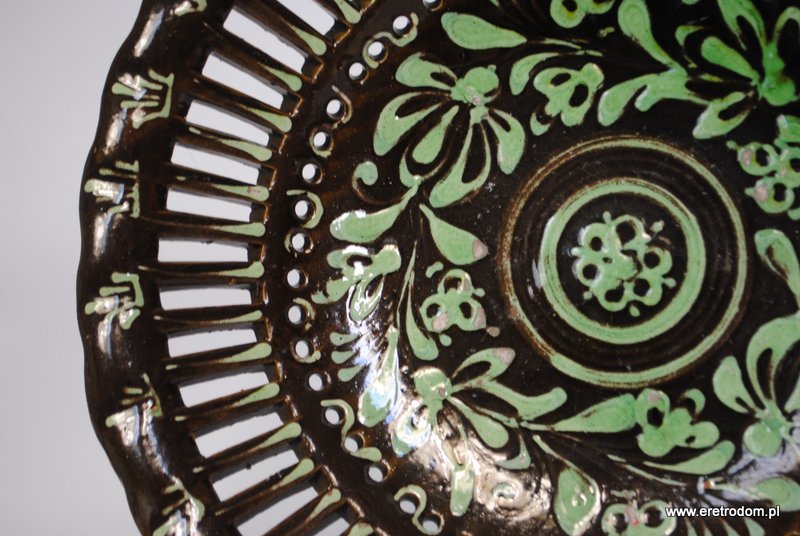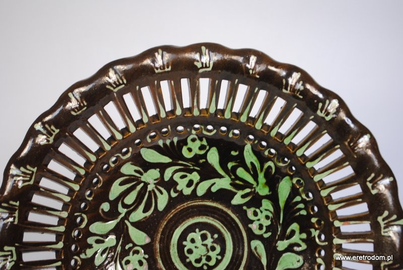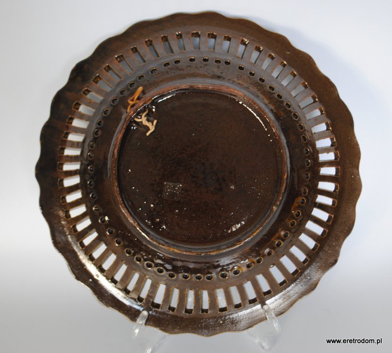 Talerz dekoracyjny, patera. Ceramika ażurowa, ręcznie malowana, szkliwiona. W tylnej części oznaczenie producenta.