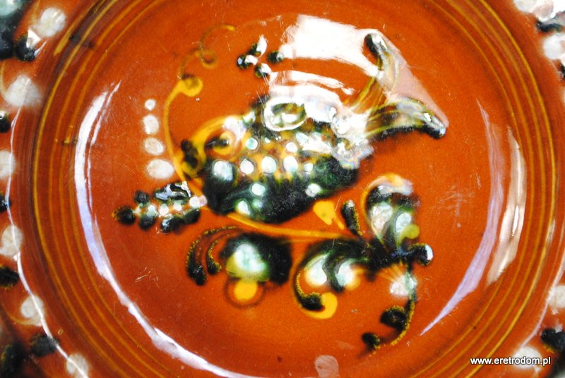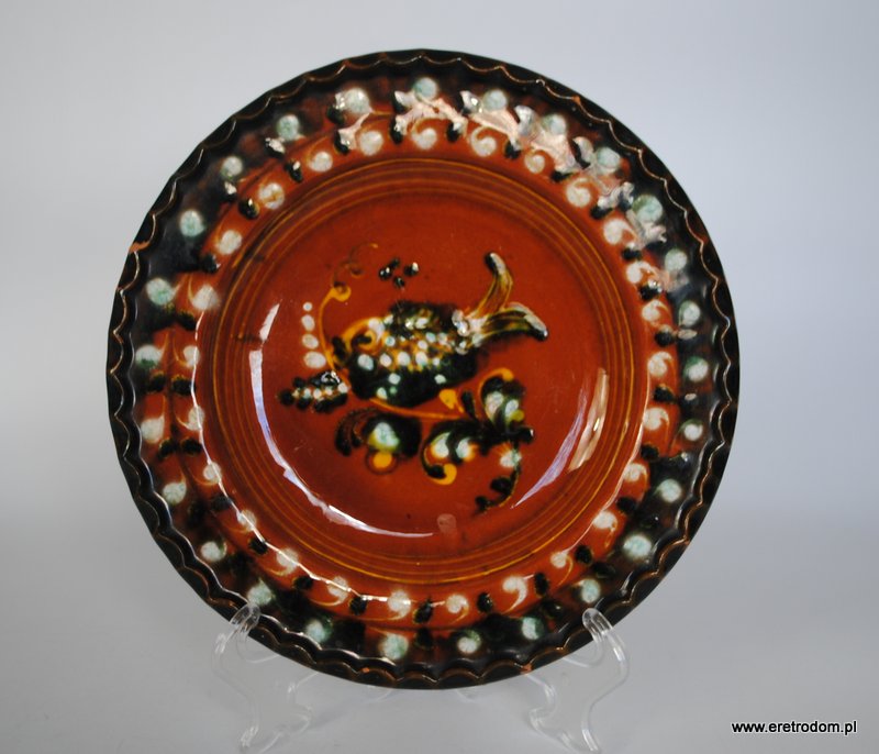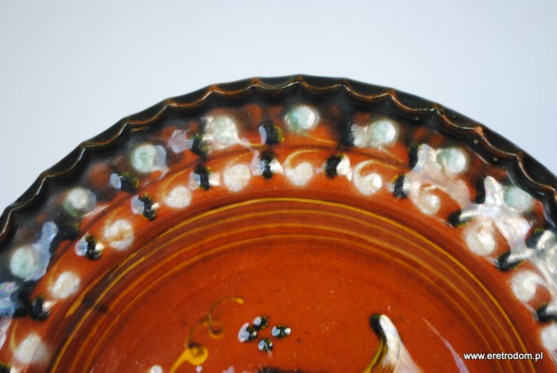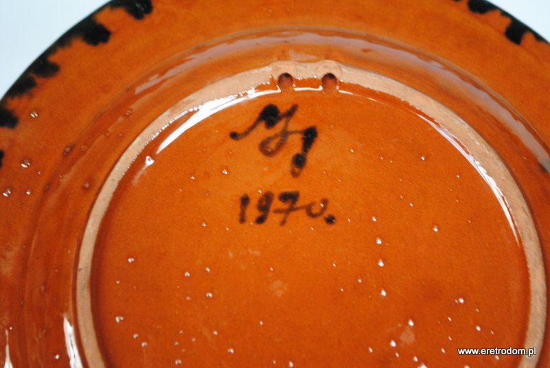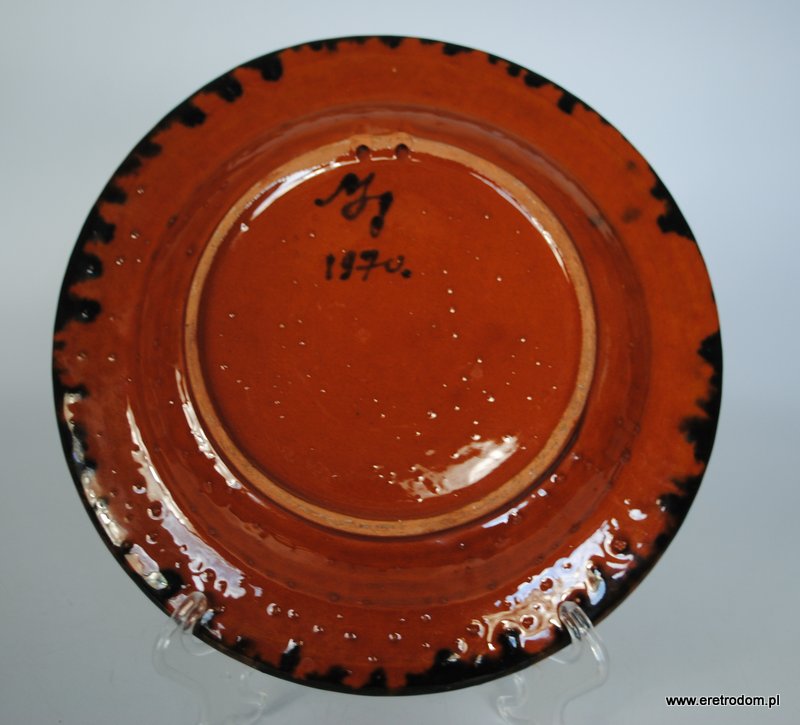 Talerz dekoracyjny, patera. Ceramika ręcznie malowana, szkliwiona. W tylnej części oznaczenie autora oraz rok 1970.