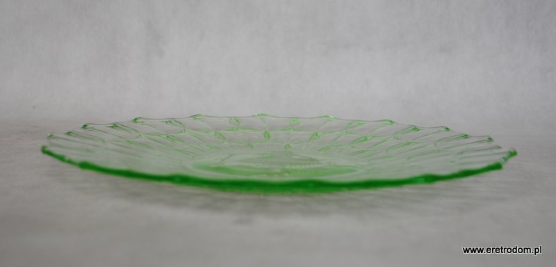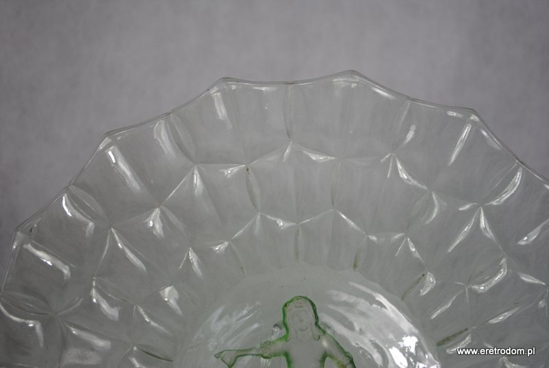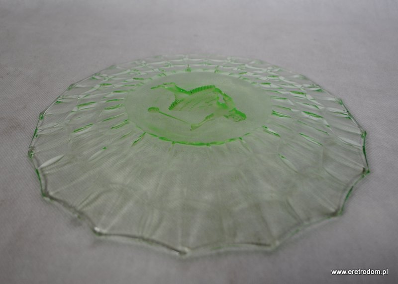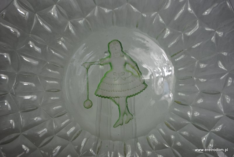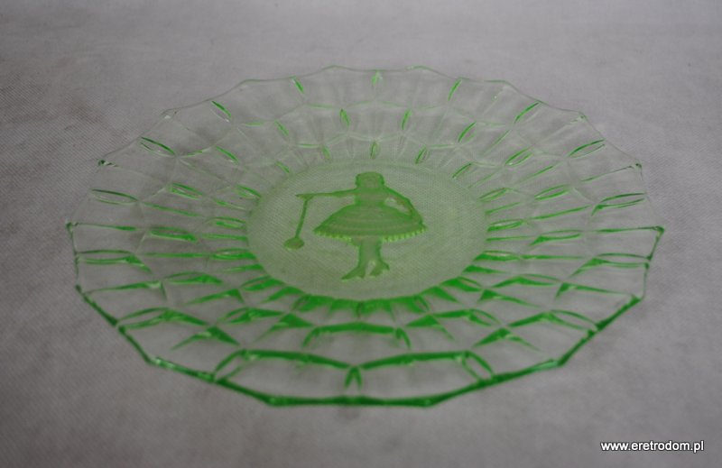 Talerz czy też patera. Stare szkło prasowane, barwione w masie na kolor zieleni uranowej. W centralnej części widnieje dziewczynka bawiąca się jojo.